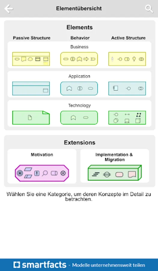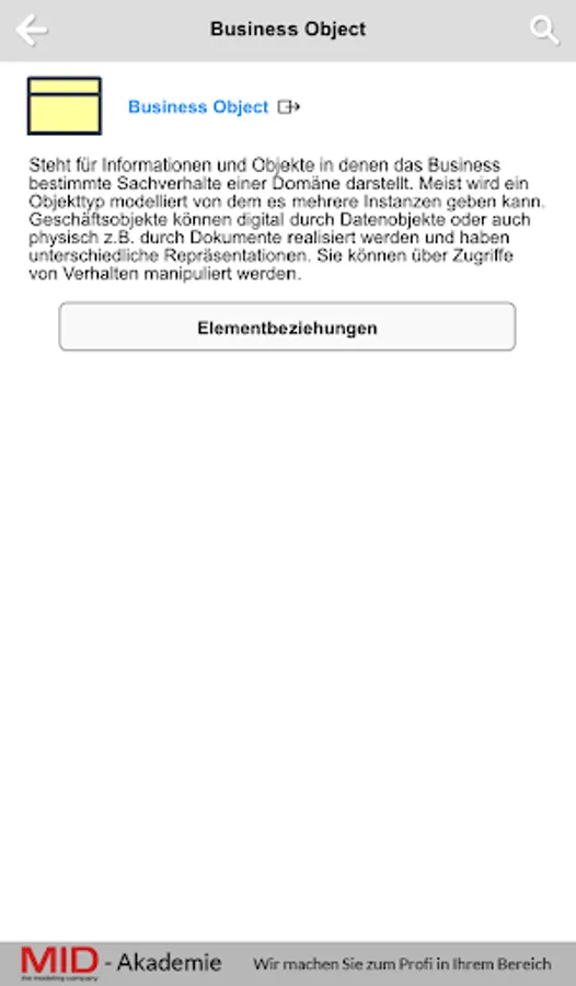 Besides the description of the modeling elements and the possible relationships between elements can be determined. A link to the specification completes the scope of the app.