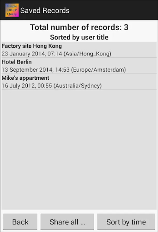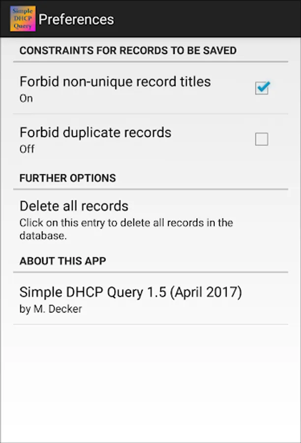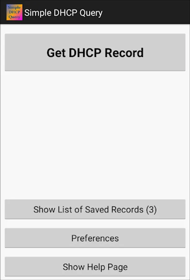 Simple DHCP Query is a free Android-app for reading out the information received from a DHCP server for the current WLAN connection, e.g. IP address of gateway, DNS servers, own IP address & network mask. This information can be saved by the app for later reference. Further can the homepage on the current gateway server be opened in a browser; this page is in many cases the login page needed before the WLAN can be used.