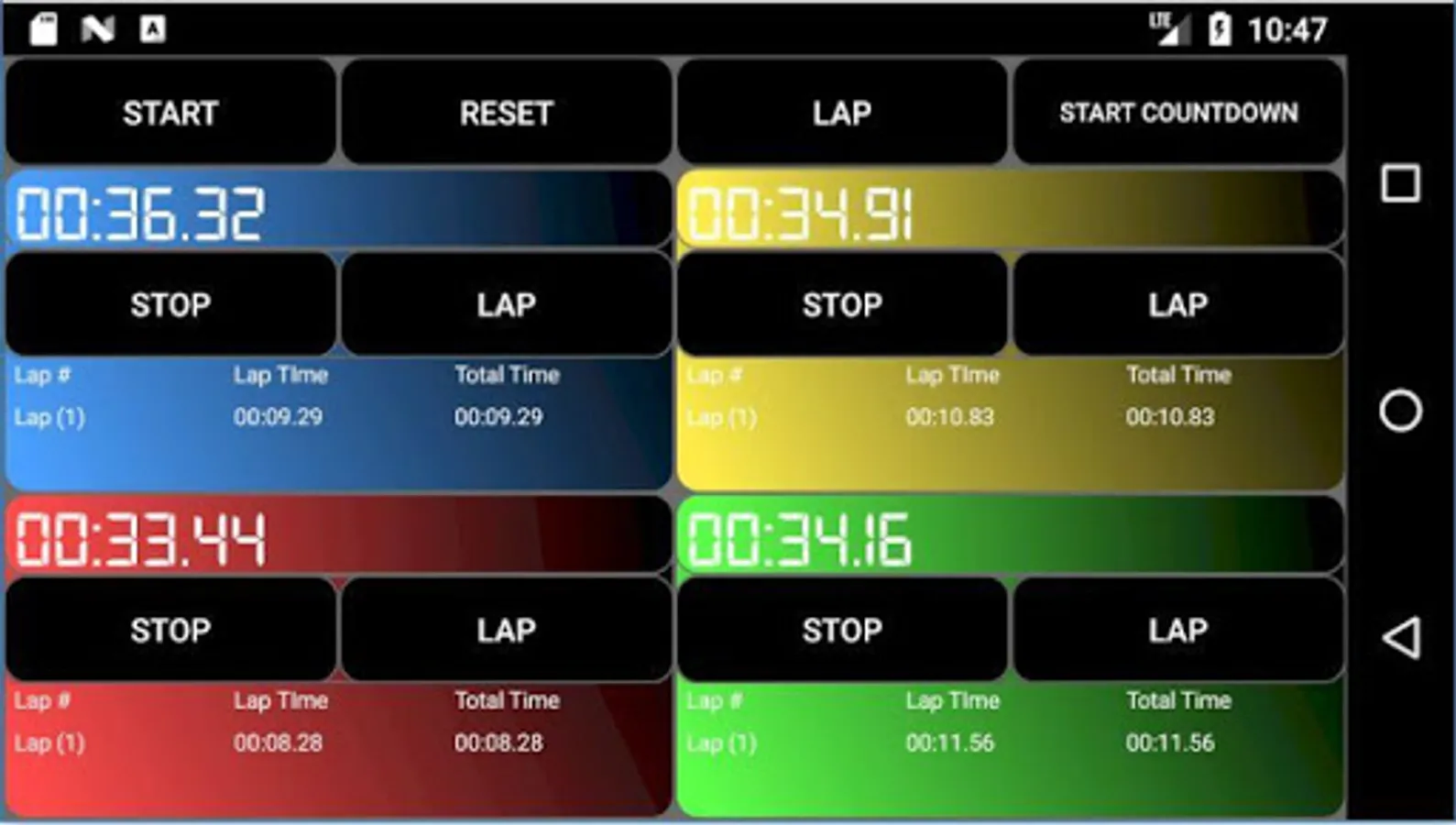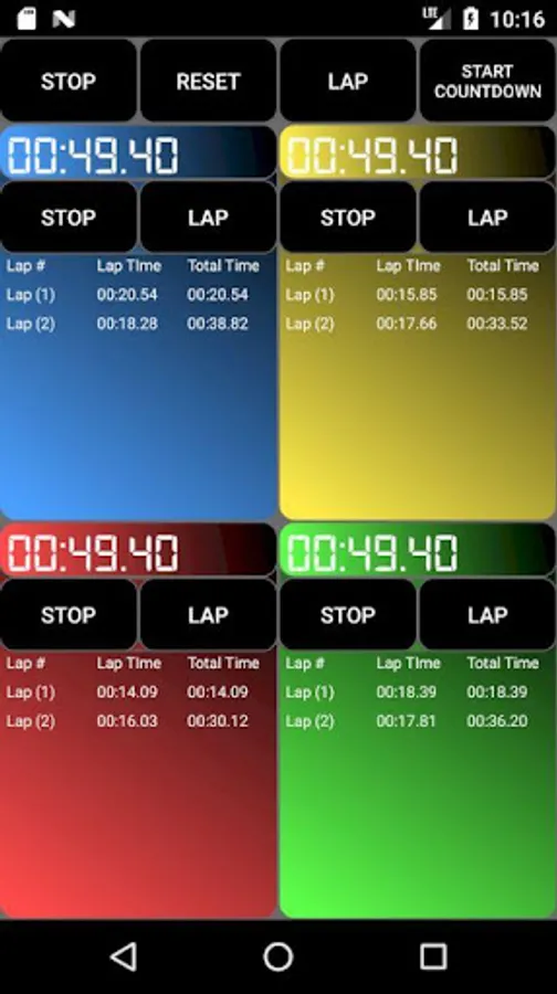 - Ability to Start/Pause/Lap all timers at the same time.