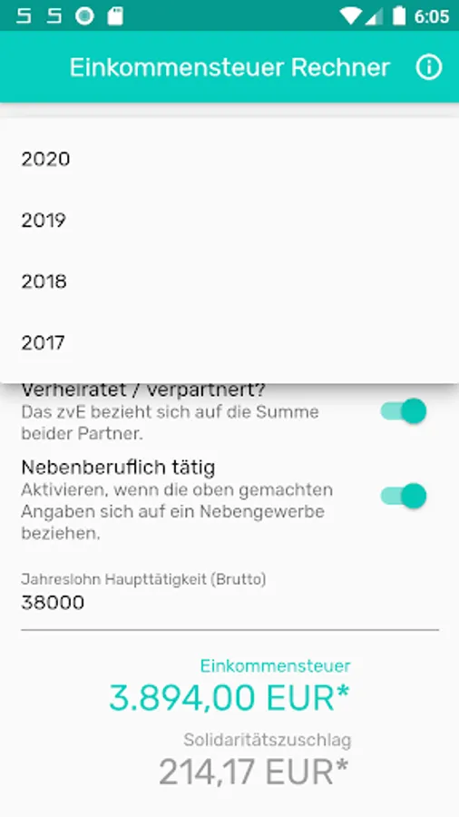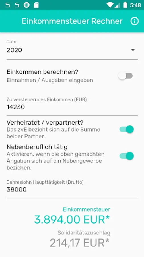 As a self-employed person you have to deal with all sorts of bureaucracy. This app will help you to calculate your expected income tax + the solidarity surcharge.