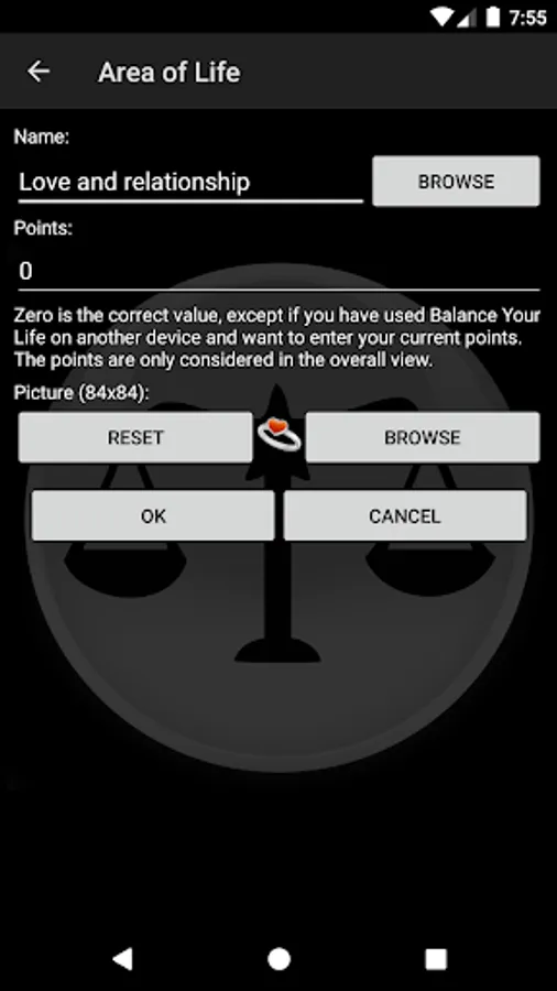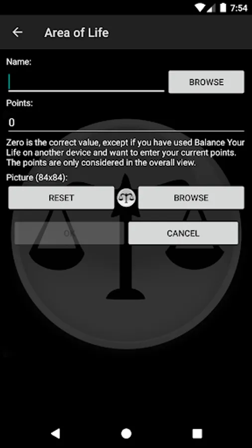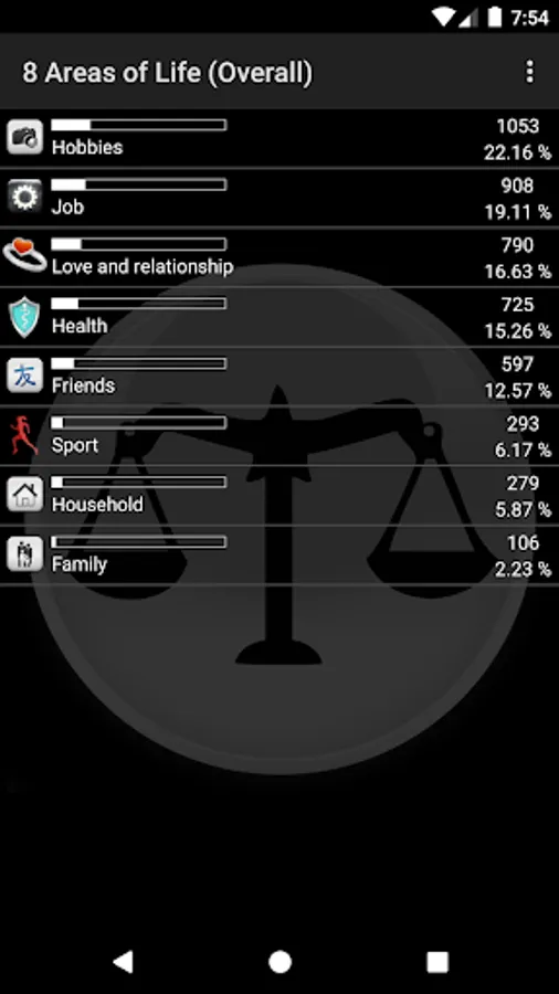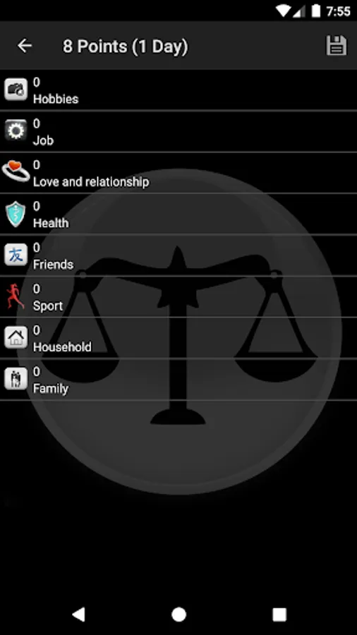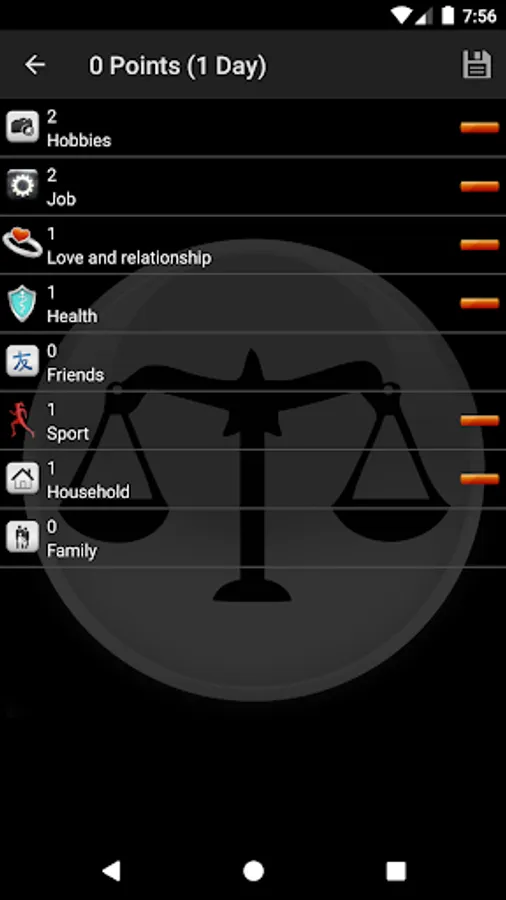 Balance Your Life allows you to occupy you playfully with your own life areas, to become conscious by you of your lived priorities and to control this by your own action. How does this go? Quite simple. In Balance Your Life you create for each of your areas of life simply an entry. After 24 hours you will be able to assign points for the single areas. For every area you have created, you get a point which you can assign. How you distribute the points, takes down on how you rate the past day. Besides, you should be honestly with yourself, embellish nothing and find your own weighting.