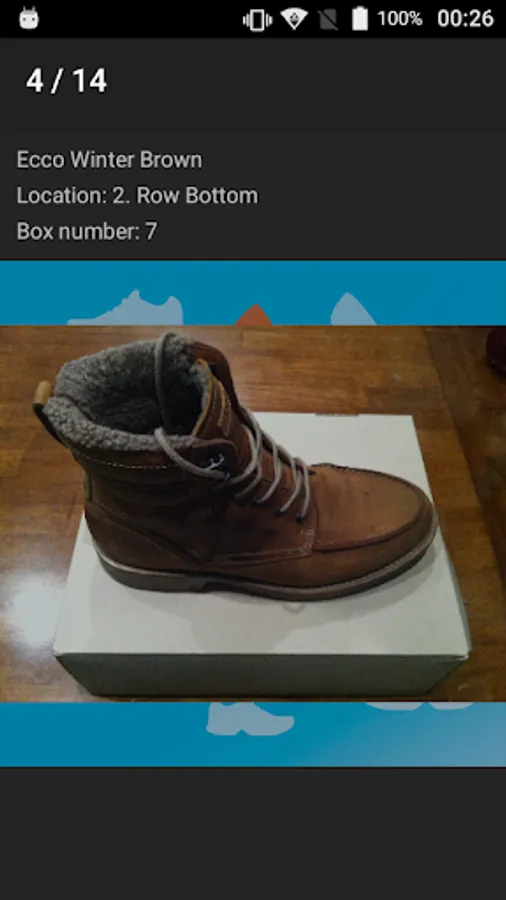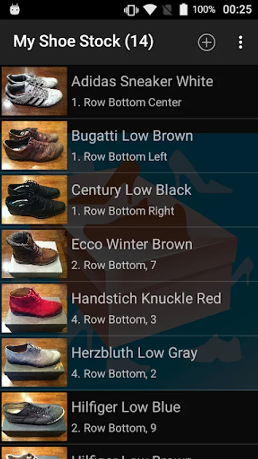 Enter each of your shoe with the manufacturer, the type, color, size, location, a photo, and the number of the shoe box or whatever else is important to you and you will find your shoes easier, clearer and quicker in your shoe stock.