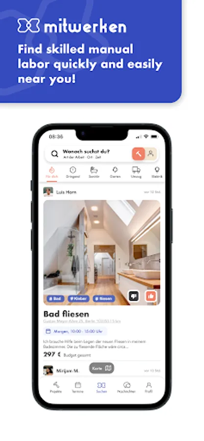 +++ Simply create a profile and off you go: As a "mitwerker" you can find jobs in your area, as a client you can find competent (hobby) craftsmen from your neighborhood.