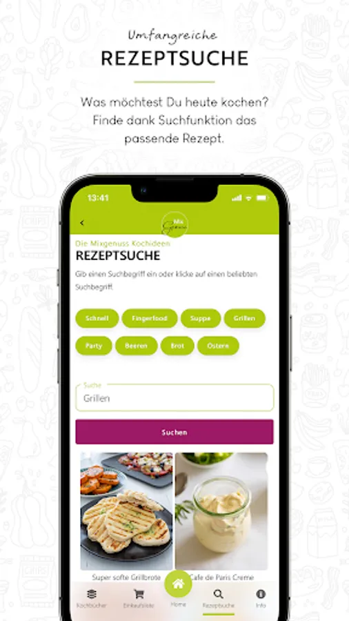 For example, let yourself be inspired by the recipe of the day or find the right recipe for your taste thanks to our search function. In addition to suggested search terms, you can also search by category, ingredient or occasion. (For example, you can search for recipes with strawberries, zucchini or chicken. Or you can find suitable recipe ideas for Easter, Christmas or for a barbecue.)