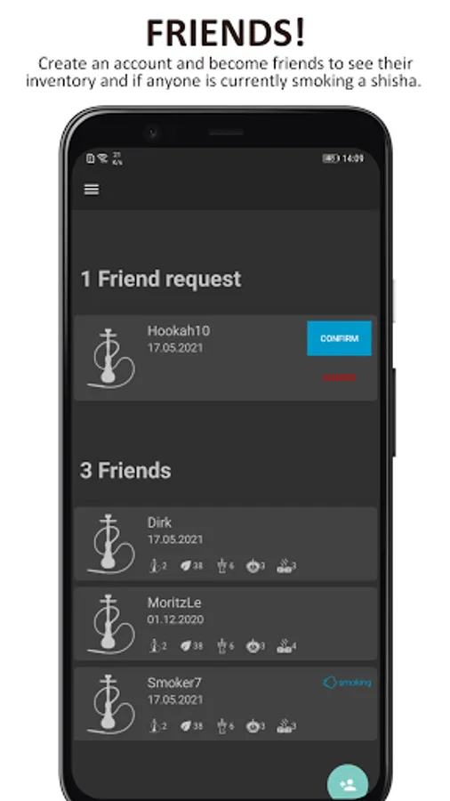 FRIENDS! Create an account to add your friends and send them a notification when you smoke a shisha!
