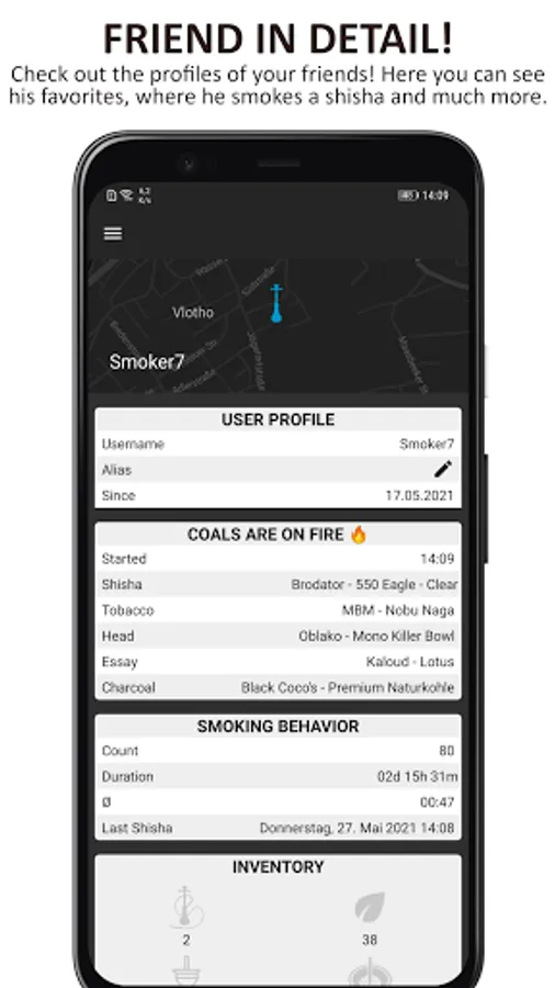 USER PROFILES! Check out the user profiles of your friends to see which setup (shisha, tobacco, charcoal,...) they prefer to use and where they are currently smoking their shisha!