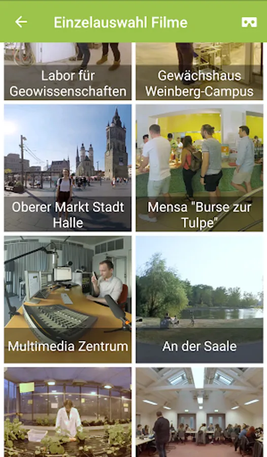 Our VR app offers 360-degree videos and interactive 360-degree panoramas impressions of the study conditions at the Martin Luther University of Halle-Wittenberg (MLU) and the attractive university town of Halle (Saale) at the same time cultural capital of Saxony Anhalt. The optimal effect of full spherical images you achieve by using a VR glasses, such as. Google Cardboards.