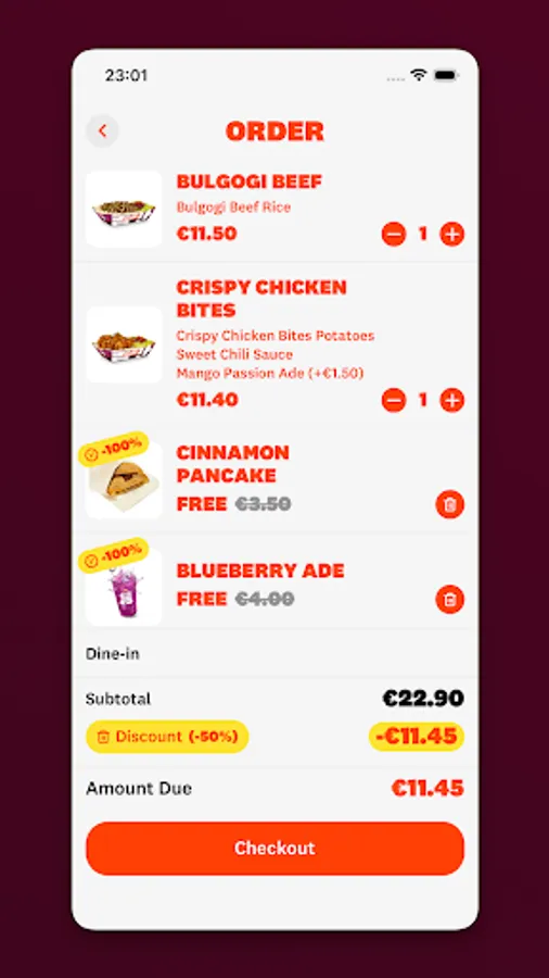 Vouchers & Rewards: welcome voucher with 50% off, birthday voucher, free drinks, extra sauce, cinnamon pancake & more – all redeemable with a single tap.