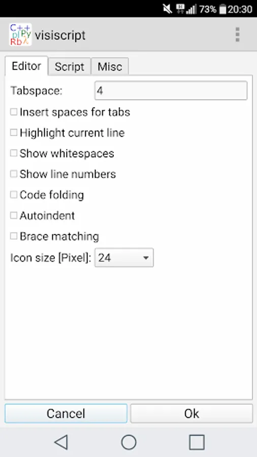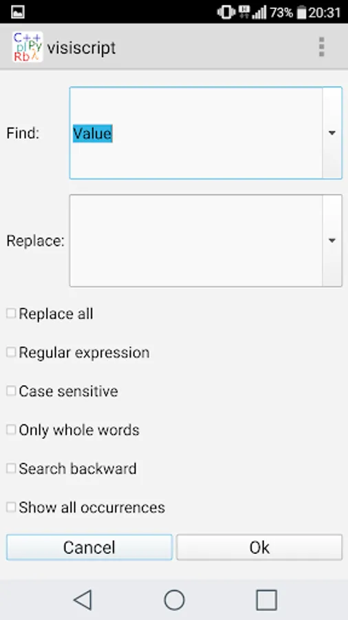 For advanced functions (navigate in source code, find in files, encrypt files, graphical output and debugger support for Python and minscript) and aditional script interpreters (minscript, Lua, Python, Haskell/Hugs, Scheme/Scheme48, newLisp) use the VisiScriptExtensions module: https://www.google.com/url?q=https://play.google.com/store/apps/details?id=de.mneuroth.visiscriptextensions