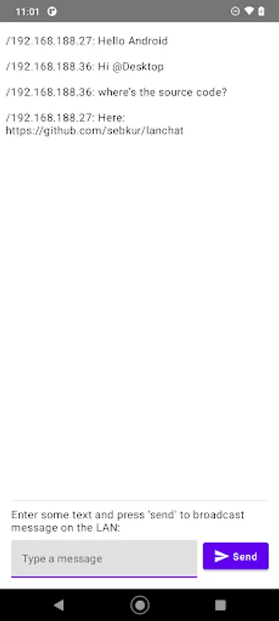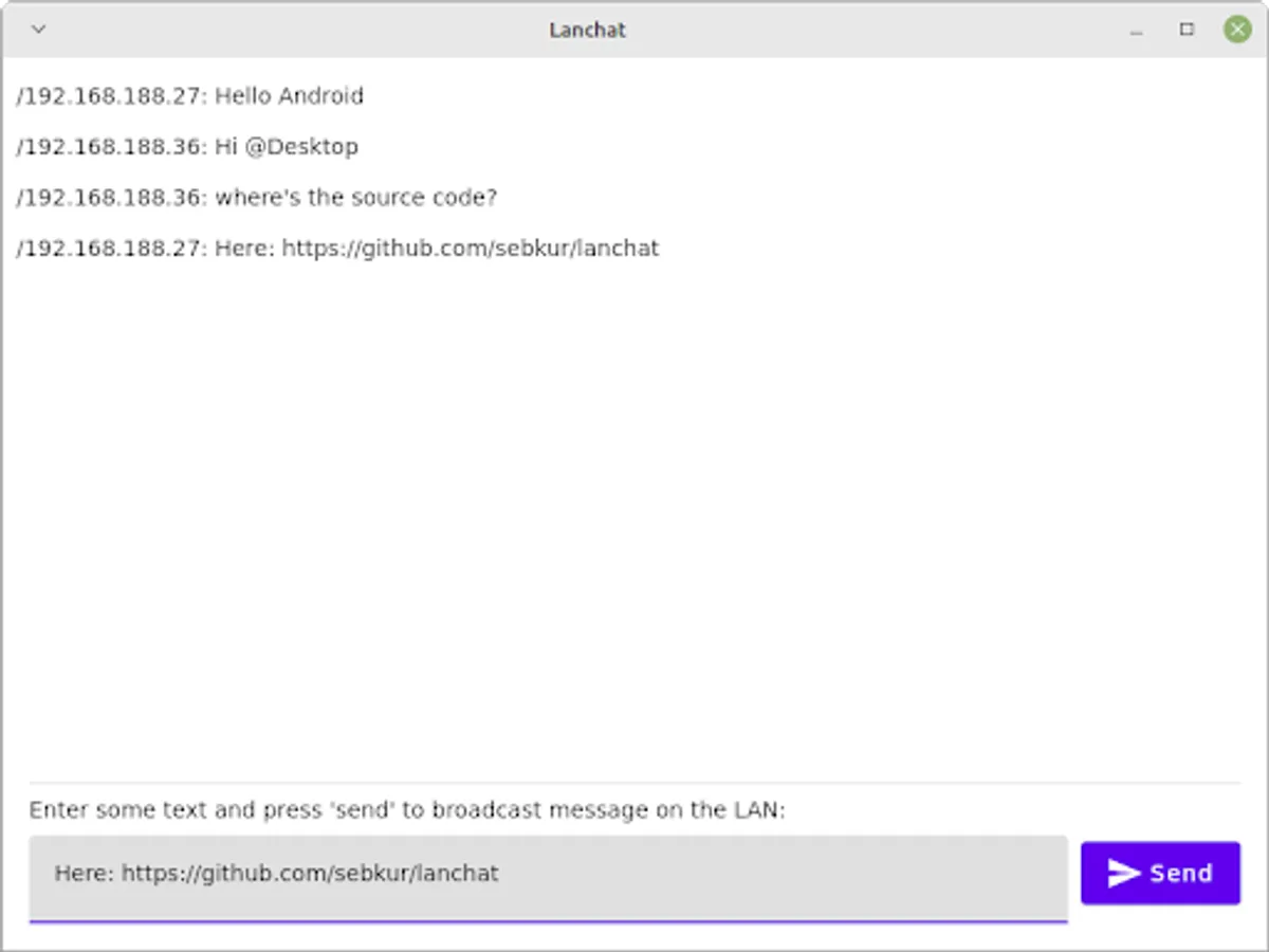 It's like analogue radio, there's a bunch of channels and anybody can tune in. Just choose your channel (a port in this case) and start sending and receiving messages. Please keep in mind that this is totally insecure and everybody on the same local network can read anything you send across the wire.