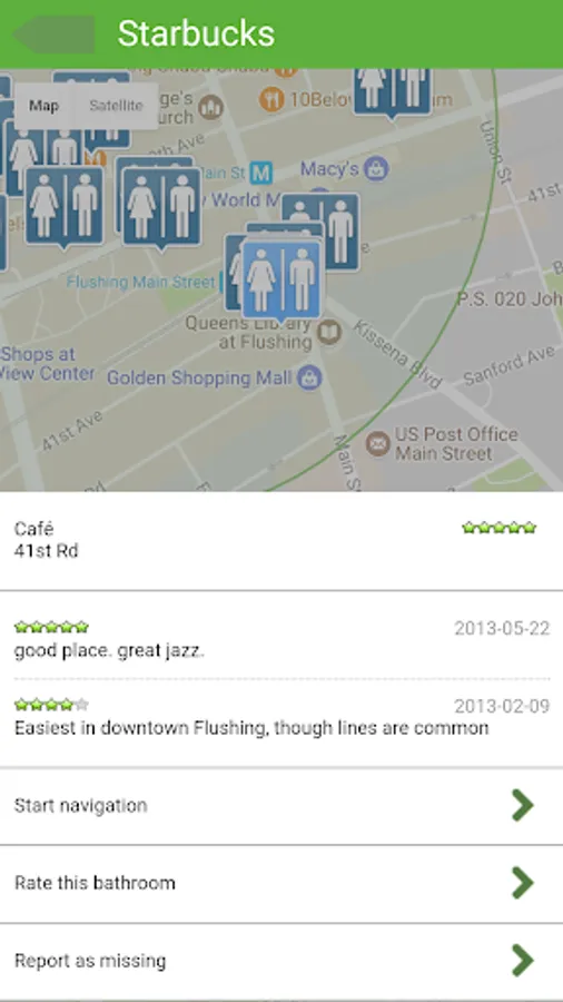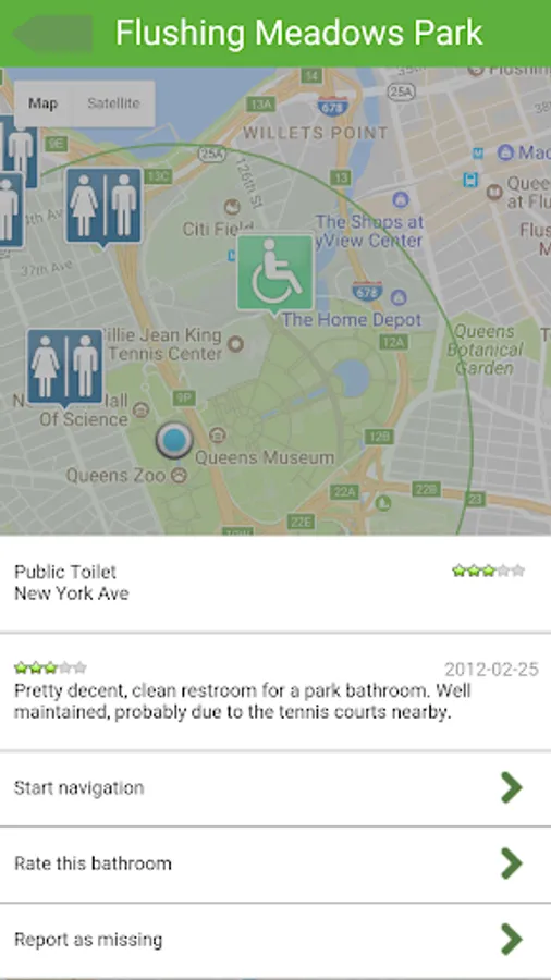 We would be thankful, if you rate the restroom you just visited in order to help us to improve our toilet finder for you. You can notify us with the push of one button if a toilet does not exist. We also would be happy to receive any other feedback by mail or via the 'feedback' button from the application menu. If you enjoy using our bathroom finder, we would also appreciate your rating!