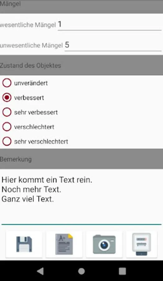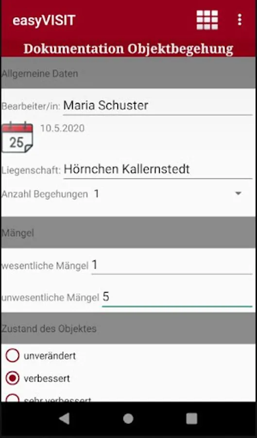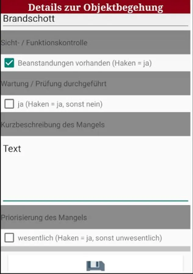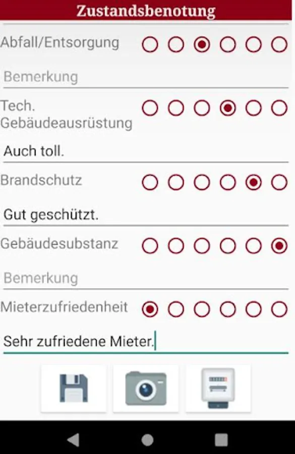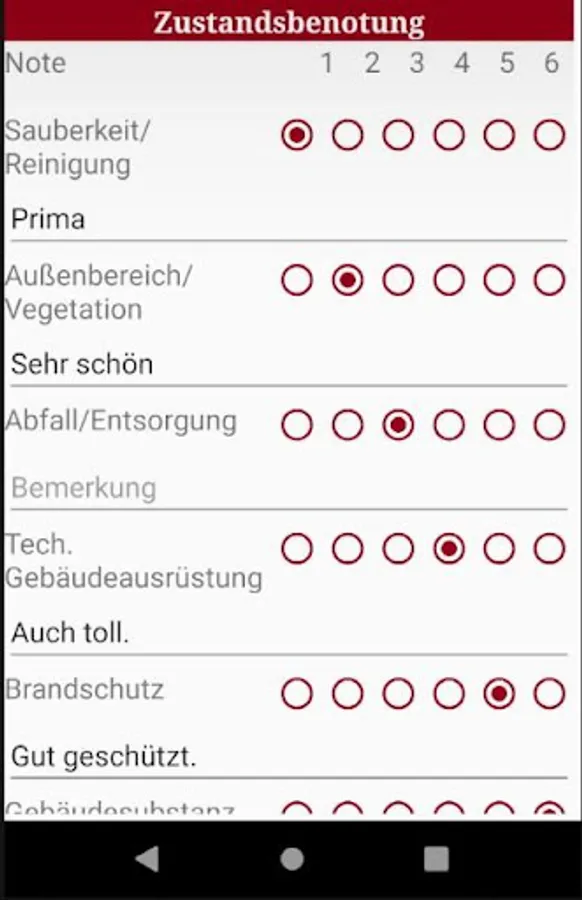 Cleanliness, outdoor areas, waste, technical building equipment, fire protection, building substance, tenant satisfaction can be rated quickly with grades of 1 - 6 and the content can be completed with comments and photos.