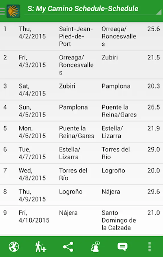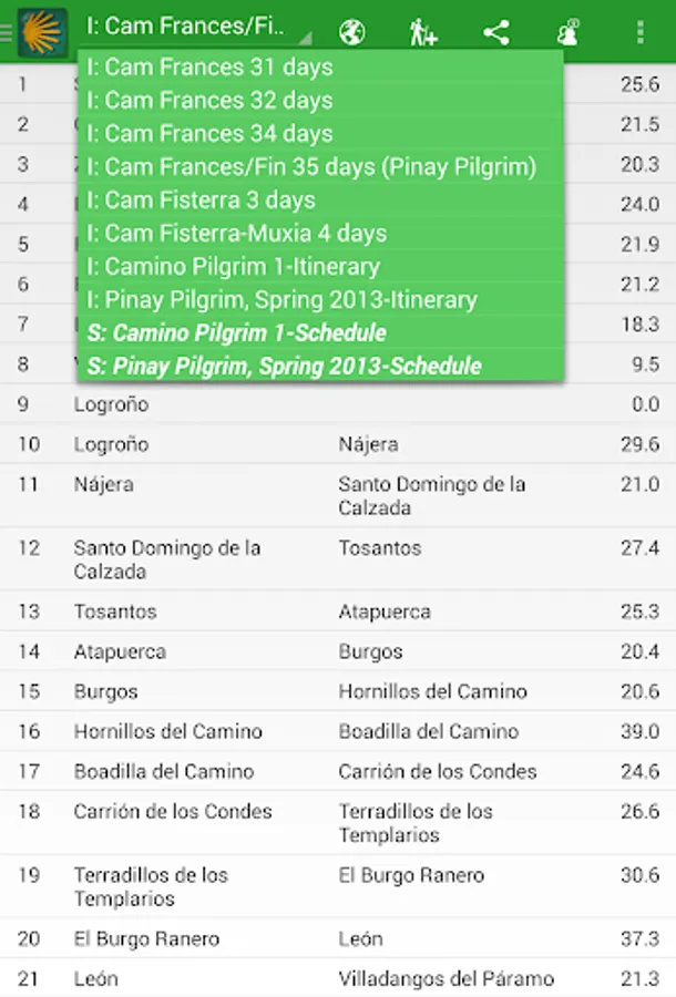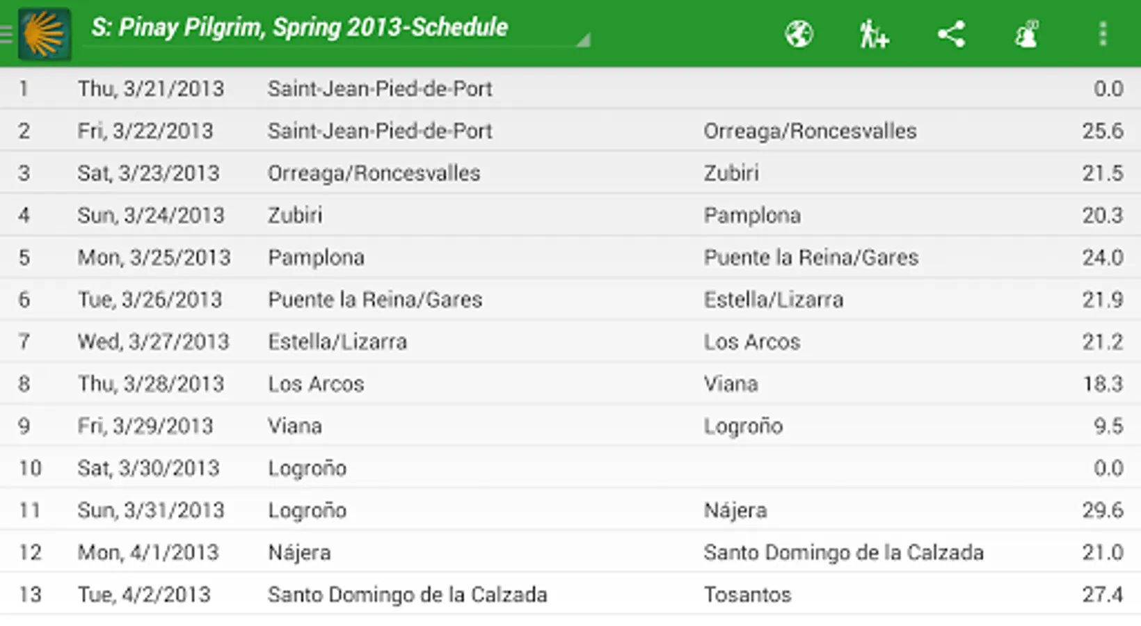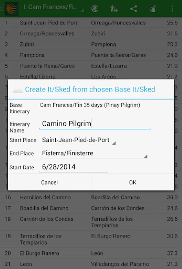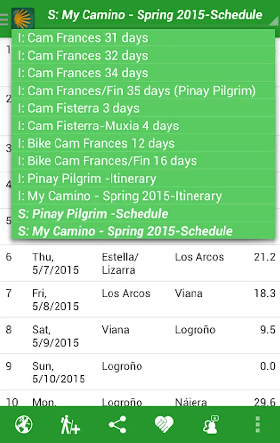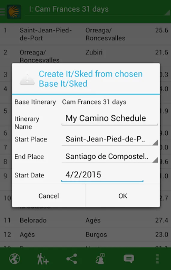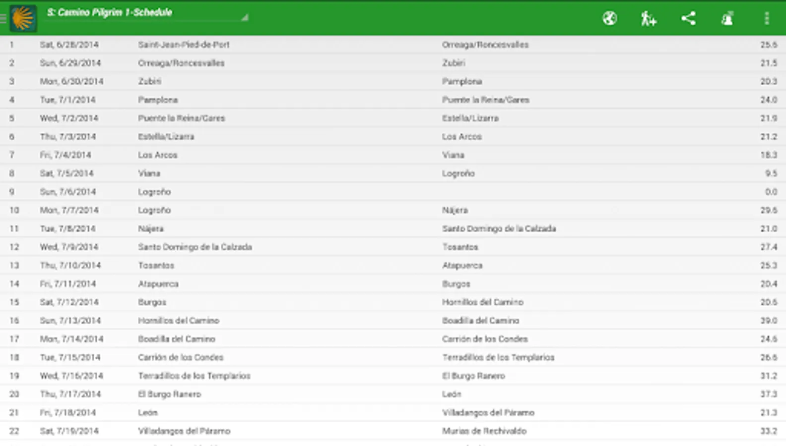 - Simply click on the hiker icon to create your very own Camino schedule/itinerary from system-provided base itineraries -- with your specified start dates, and cities to start and stop in