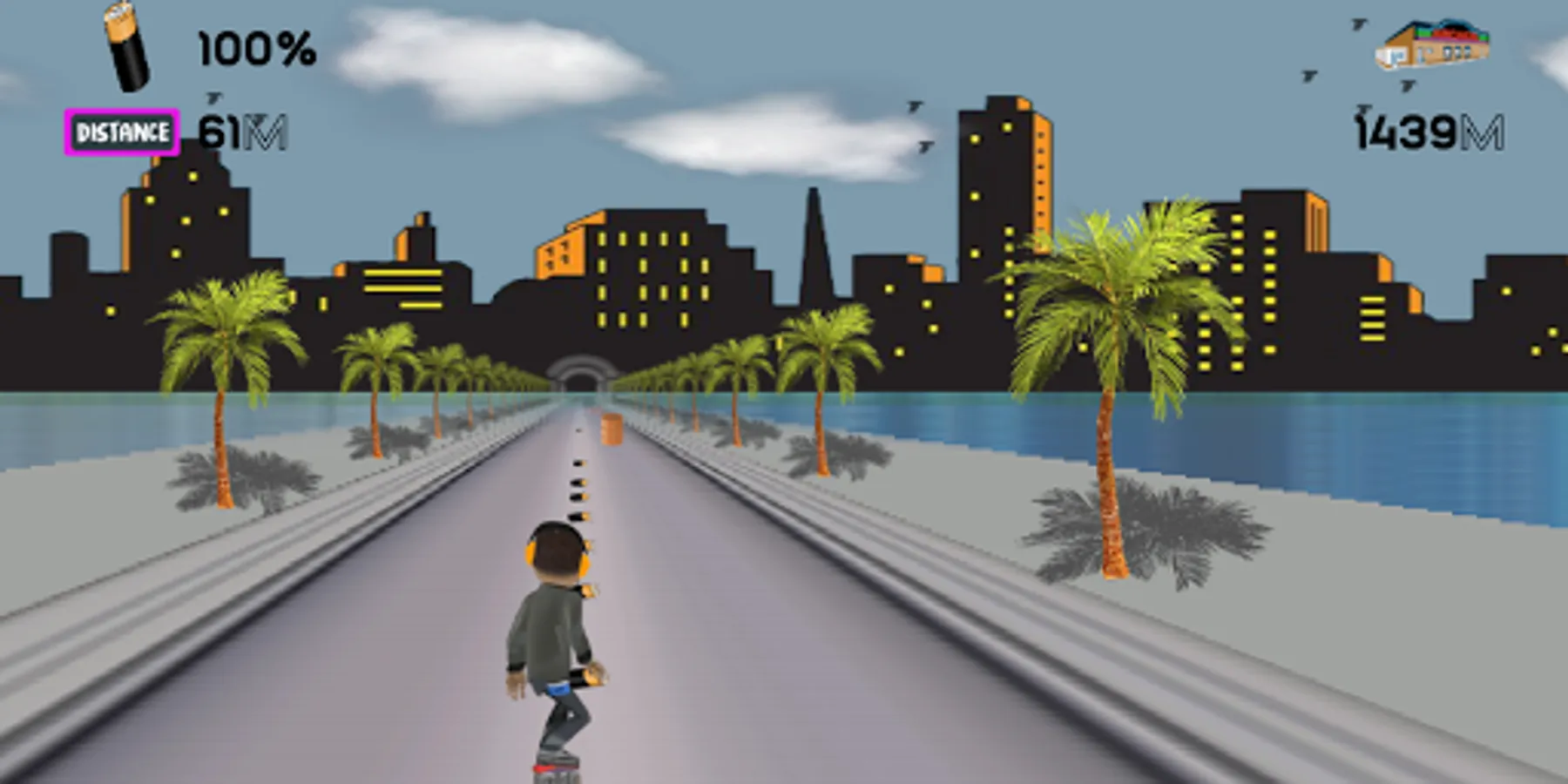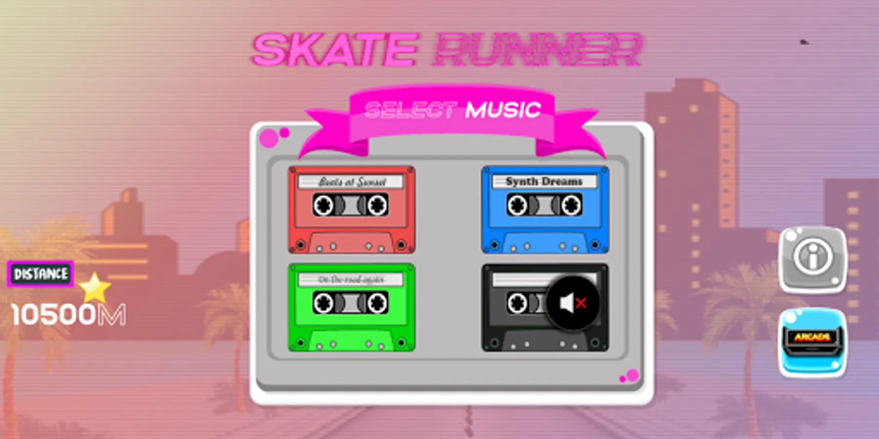 Skate through the streets of 1984 while listening to 80s synthwave music, but make sure, that you don't run out of batteries for your walkman.