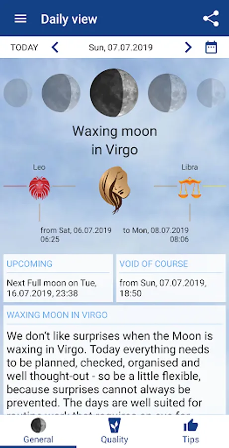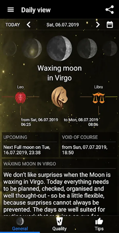 In a small guide you will also receive additional information about the moon, biorhythm, moon phases, void of course, zodiac signs, elements, as well as functional instructions for the app.