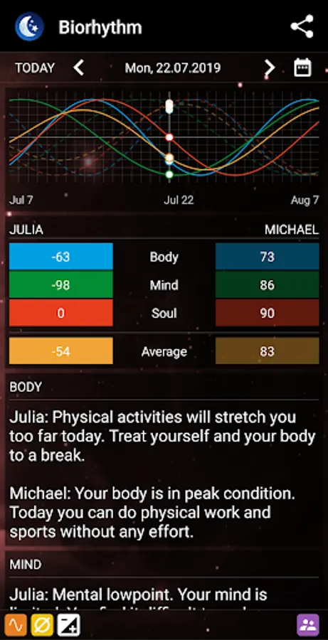 The biorhythm calculates your personal high and low phases for body, mind and soul, as well as for the secondary biorhythms aesthetics, intuition, awareness and spirituality. In addition to the well-known symmetrical sinusoidal curves, the biorhythm can also be calculated asymmetrically according to Paungger and Poppe.
