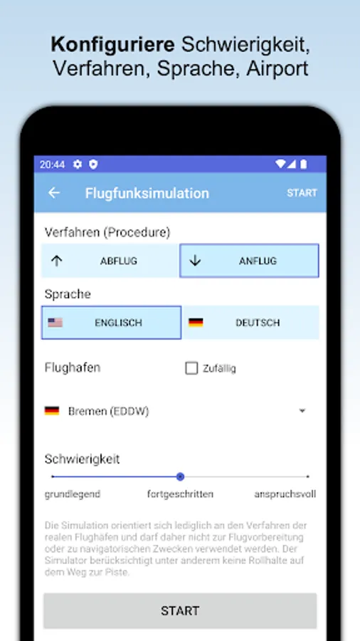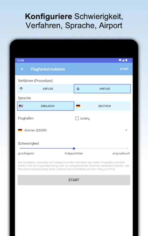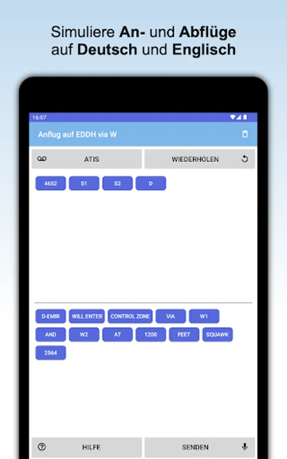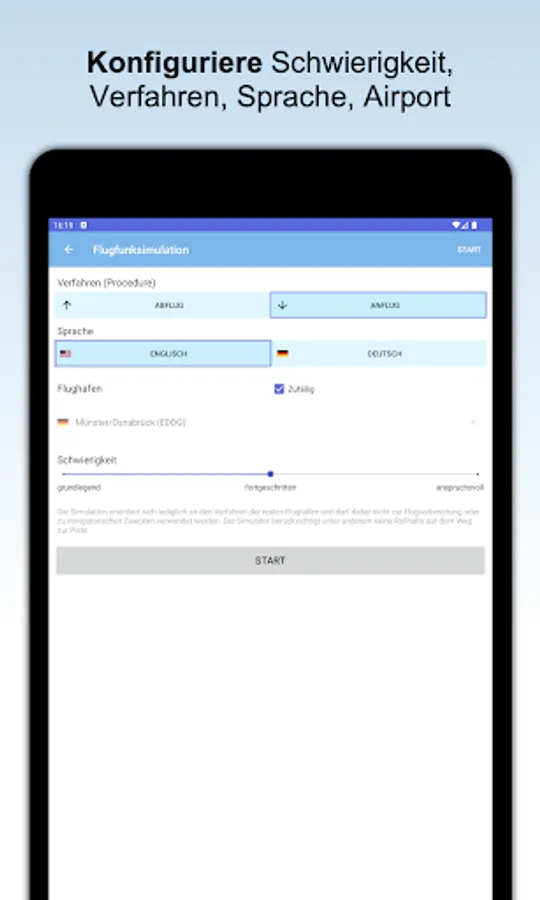 To do this, users can simulate arrivals and departures at several German and Austrian commercial airports. The radio communication takes place either in German or in English. The interface of the simulator is very simple: no loud pronunciation is required! The radio messages spoken by the app are answered by assembling ready-made message modules for the correct transmission.