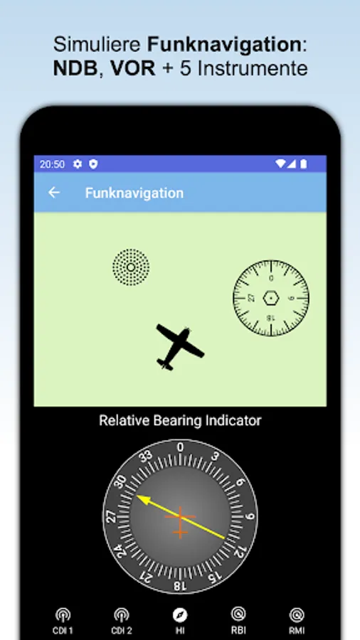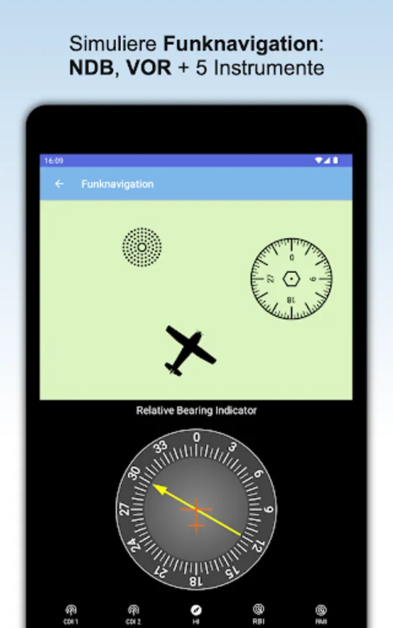 A simulation of radio navigation procedures is also included in the aviation radio trainer. Both procedures in connection with non-directional radio beacons (NDB) and rotating radio beacons (VOR) can be simulated. Five replicas of different navigation instruments are available.