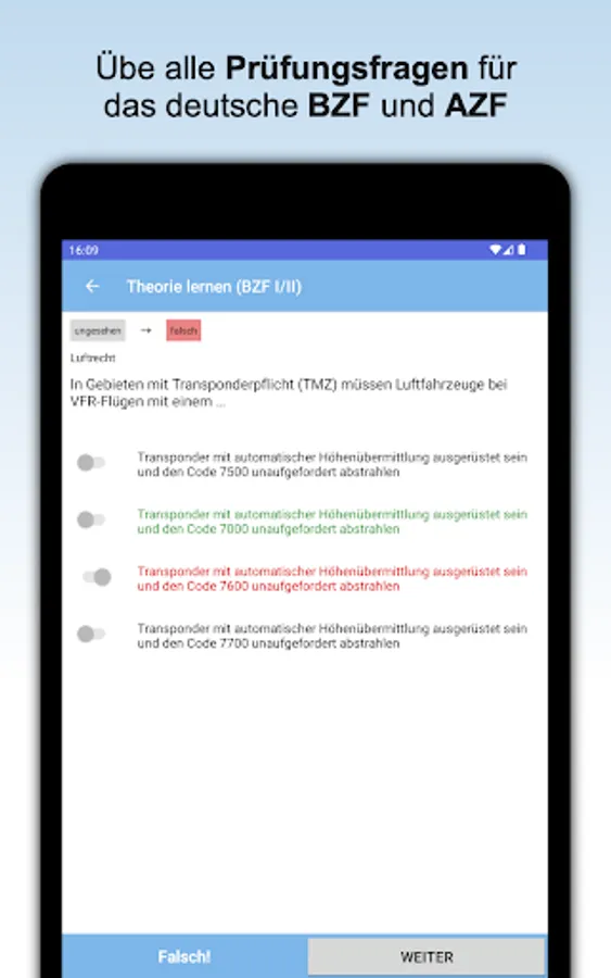 The app supports you in preparing for the practical part of the test for the "restricted radiotelephony certificate for the aeronautical radio service" (BZF). However, pilots who are already trained and other interested parties can refresh and consolidate their knowledge of VFR aeronautical radio with the air radio trainer.