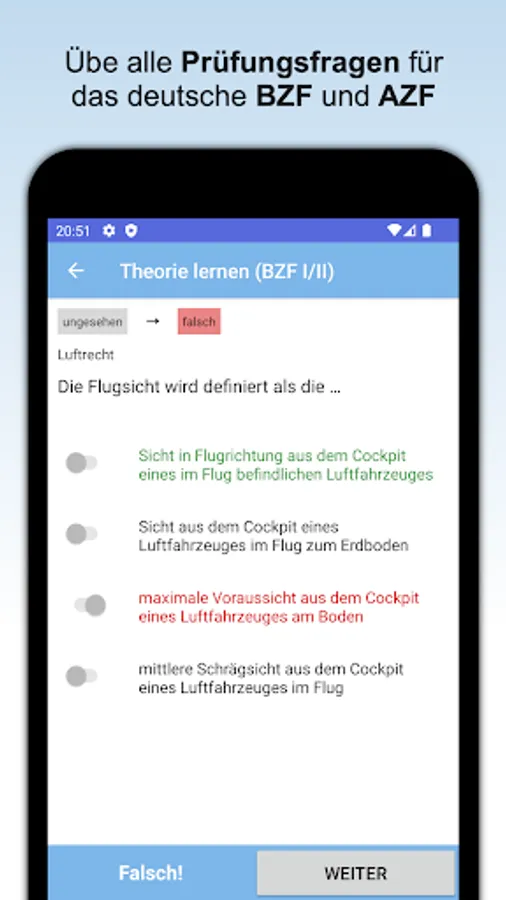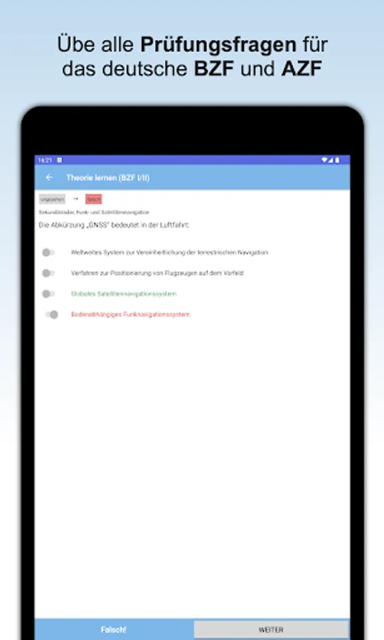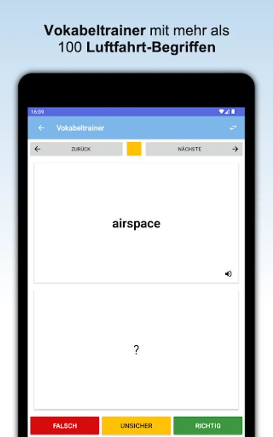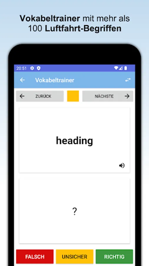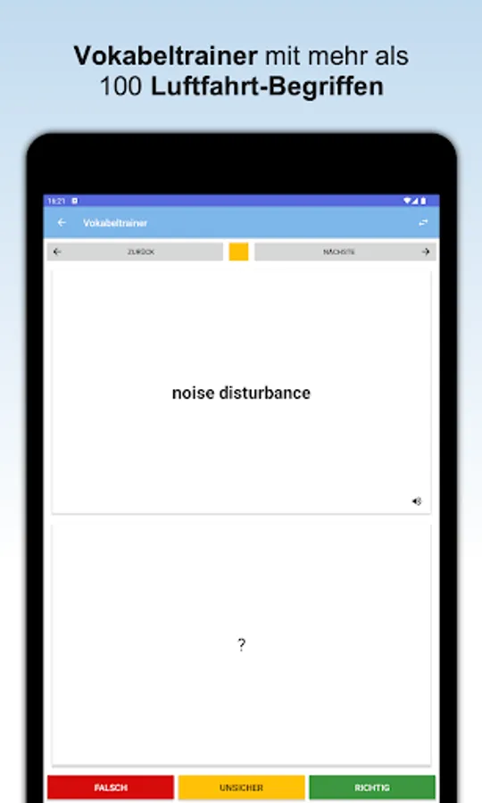 In addition, the app helps to build up a vocabulary for communication in aviation English. A vocabulary trainer is available for this purpose, which includes over 100 aviation-related terms.