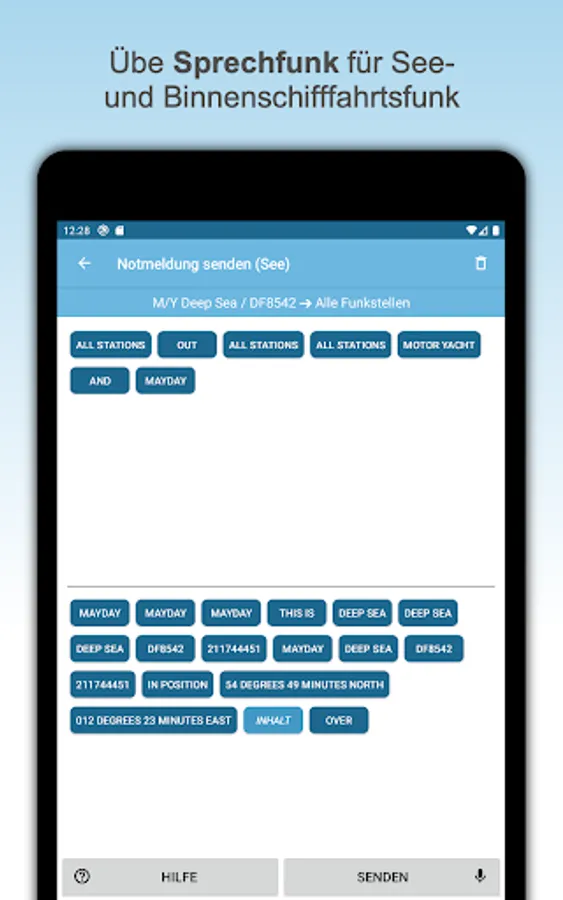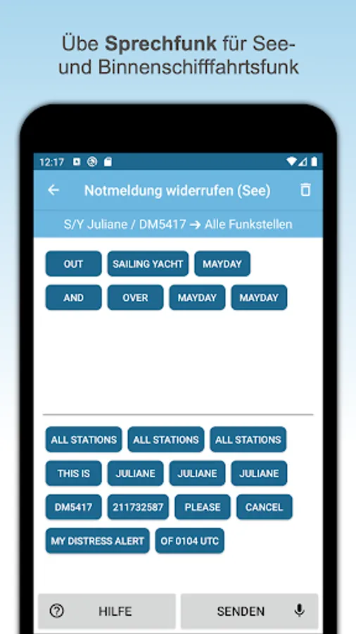 With the ship radio app, you can playfully prepare for the exams for the VHF radio certificates SRC (sea) and UBI (inland) before! With the app you can practice radio messages and learn for the theory test. The English Marine Radio Texts are also included.