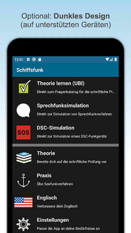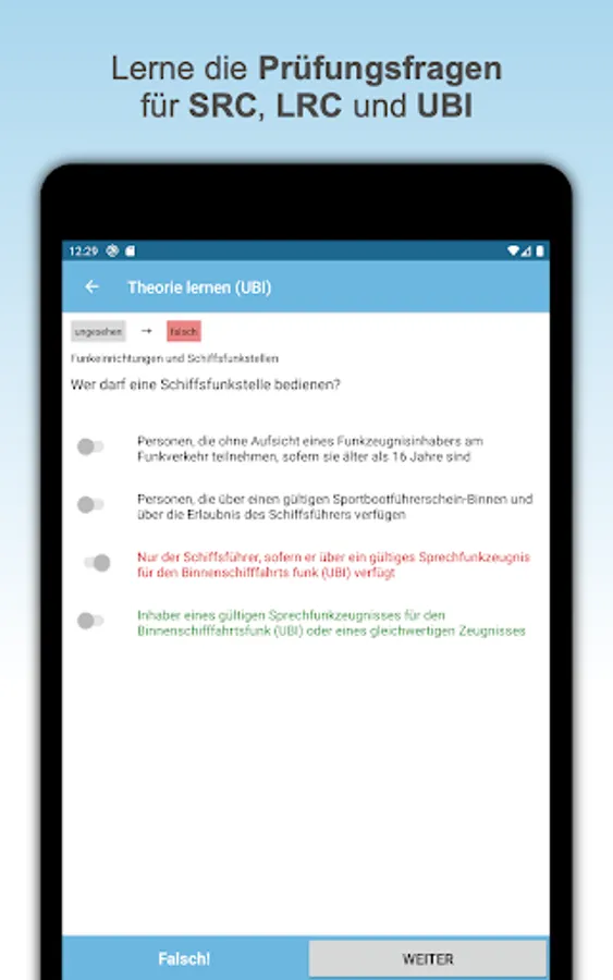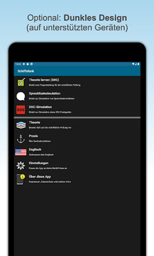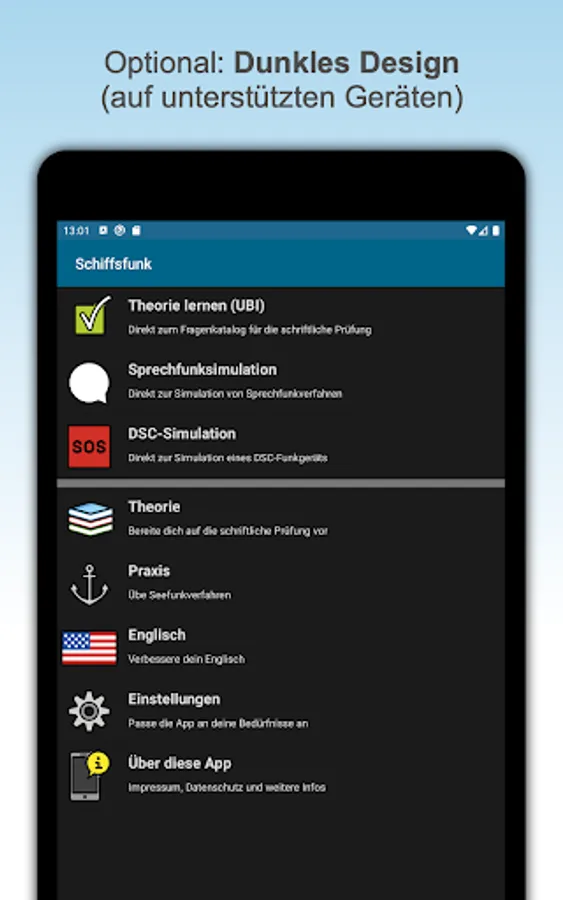 The ship radio app also helps when preparing for the theoretical exam. The integrated theory trainer contains the questions for the German radio certificates SRC, LRC and UBI (incl. adaptation and supplementary examination). Incorrectly answered questions can be repeated separately and an exam simulation with random questions and a time limit is also possible!