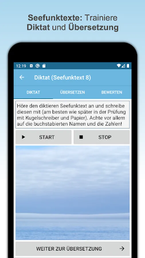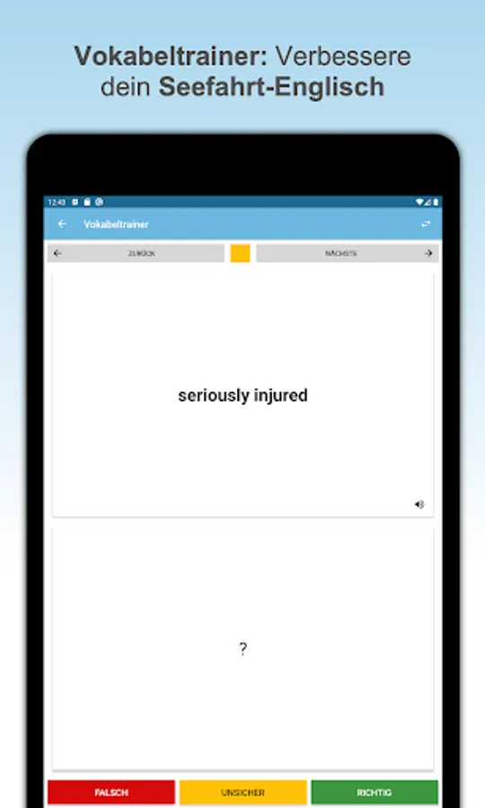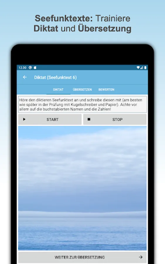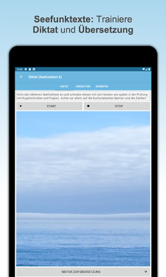 In addition, the app helps with building a vocabulary for communication in Maritime English. A vocabulary trainer is available for this purpose, which includes over 100 seafaring terms. The English Seefunktexte are also included in the app, including translations and the dictation function. Are you still having trouble with your spelling? You can also learn the spelling alphabet with the app! She has her own quiz for this.