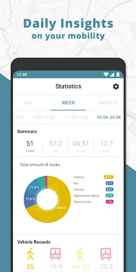 Keep an eye on your mobility. With MOTIONTAG you have your automatic mobility log book with you all the time. With the calendar you can review where you've been and how you got there. With the map you get an overview over every day. Through your personal statistics you find out which transport means were the fastest for you and which you used most often.