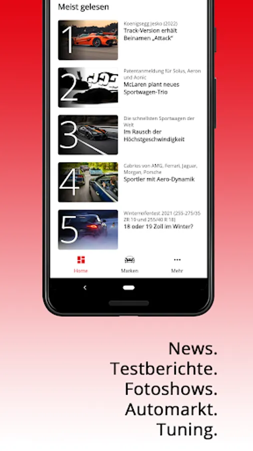 Other important topics of the app: new products, driving reports, tests, tuning, e-cars, car market