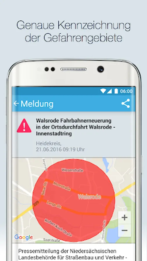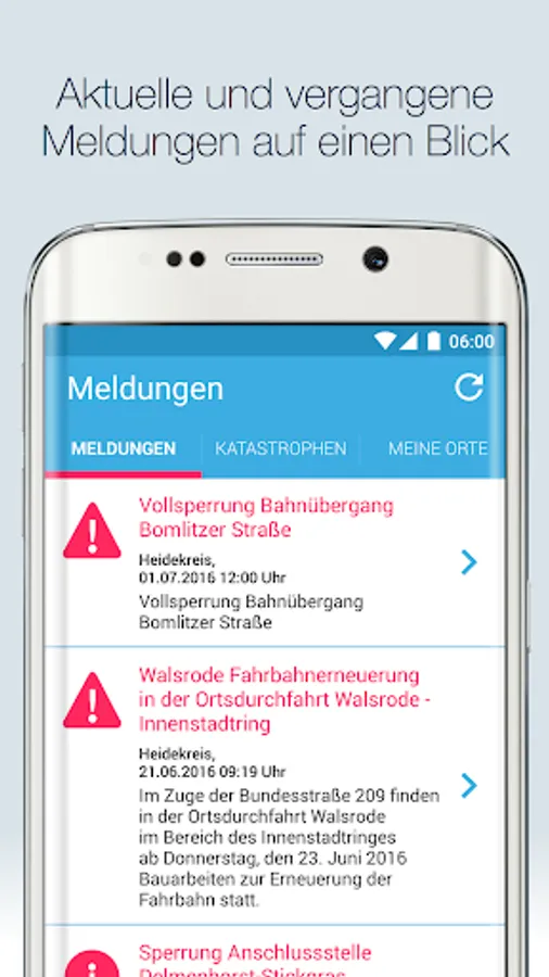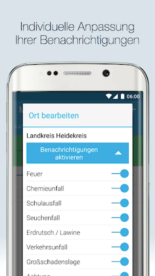Specify individually which topics you would like to be informed about, e.g. School absenteeism, traffic accidents, fire, flooding, bomb disposal or general warnings. All messages are written and created by your municipality. Your municipality alone decides which information is to be set. So you always have all the important messages from your region up to date.