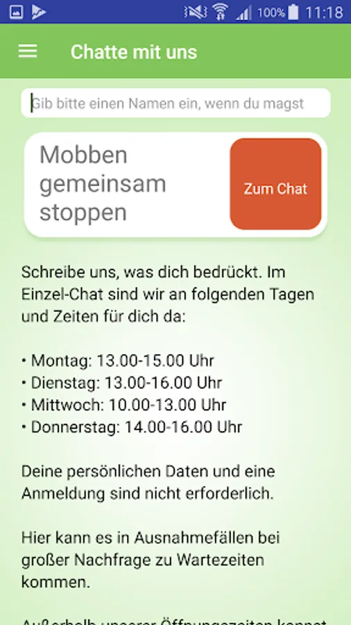 Our trained team of consultants offers you three ways to contact you with your concerns, fears, questions and much more to us: E-mail, single chat or phone. The consultation can be submitted anonymously by us.
