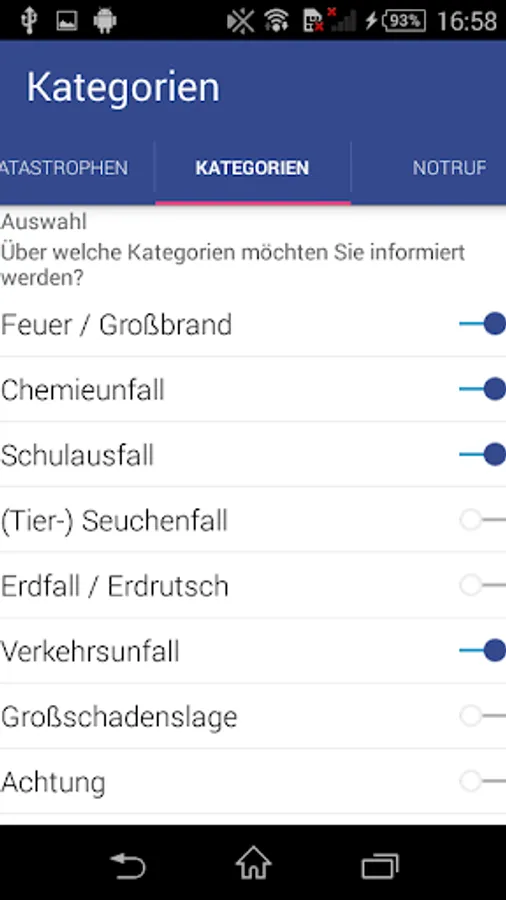 You can what topics you want to be actively informed individually specify (for example, school failure, roadblocks, general news and warnings, fire, flood, bomb disposal and others)