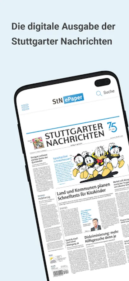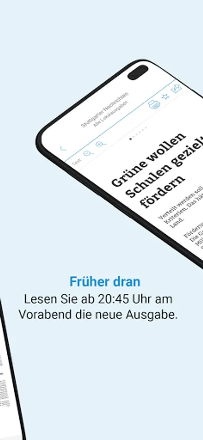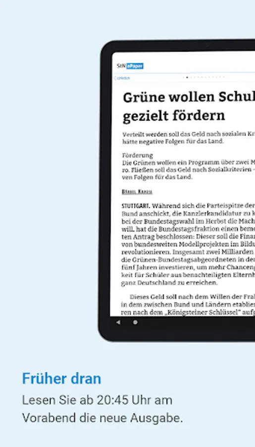 With the digital edition of the Stuttgarter Nachrichten you can read the most important things from Stuttgart, the region and around the world every day from 8:45 p.m. The StN ePaper app brings the newspaper to your tablet and smartphone in a true-to-original format. The user interface, optimized for digital reading, and many useful additional functions offer a comfortable reading experience every day.