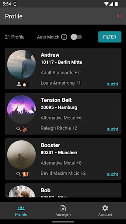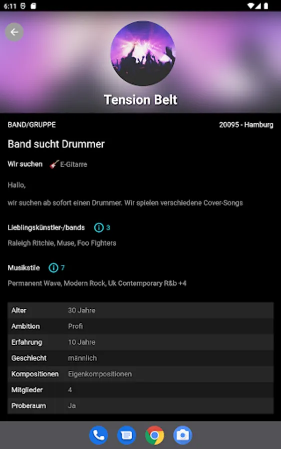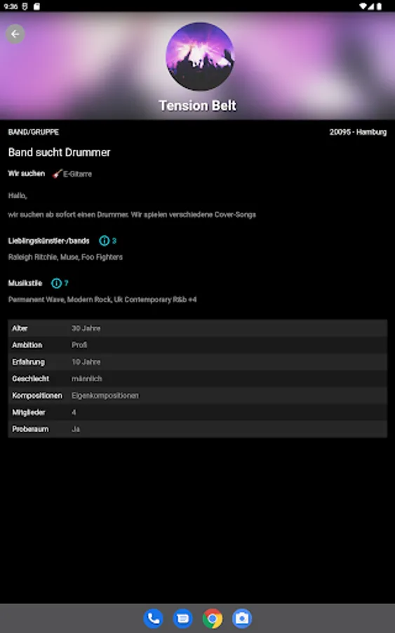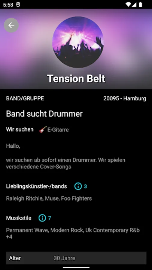 If the user is currently actively looking for other musicians, e.g. wants to found a band, a title can be entered and the profile becomes an advertisement at the same time.