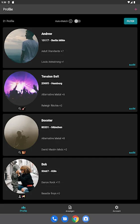 Regardless of whether it is a profile or an ad, the app brings users together based on their taste in music as a special feature. For this purpose, favorite artists can be specified manually on the one hand and imported from your own Spotify account on the other.