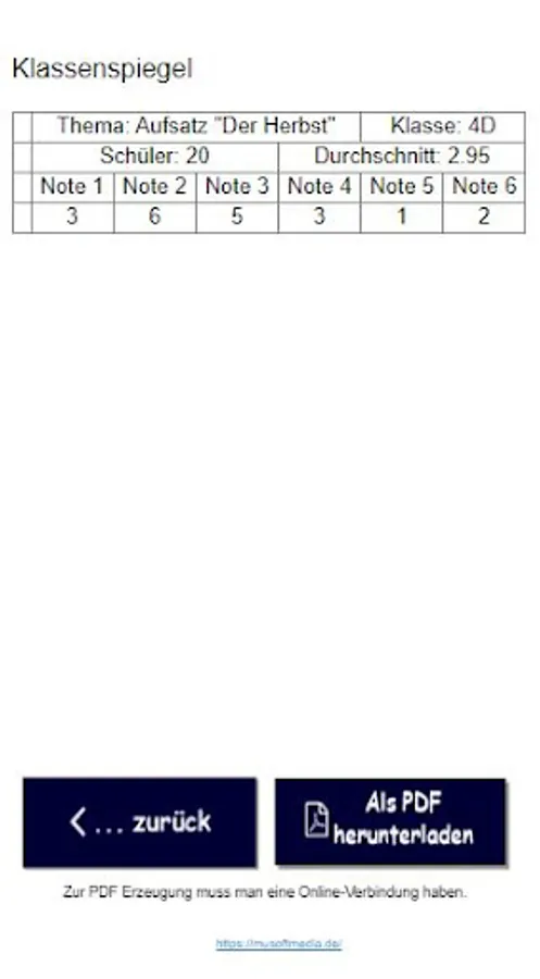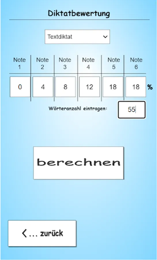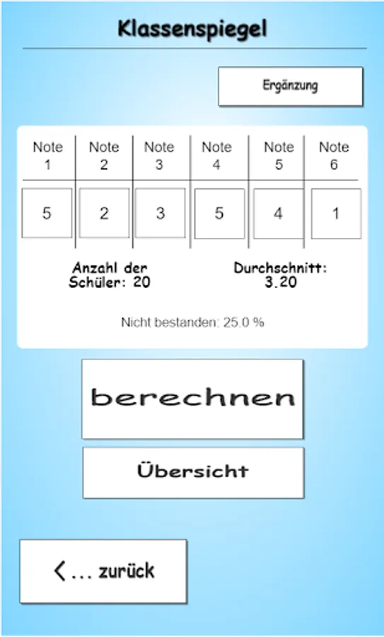 With the app you can calculate the average and quickly create a class mirror. In addition, the weighting of the grades (error quotient/evaluation key) for tests*, learning objective controls* or class tests of any subject can be calculated.