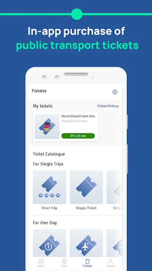 🚉 Public transport ticketing – all public transport tickets, from the popular stripe ticket, to single tickets, weekly or monthly tickets, or subscriptions/abo for all transport modes including U-Bahn/underground 🚇, bus 🚌, tram 🚋, S-Bahn/suburban trains and rail 🚅.