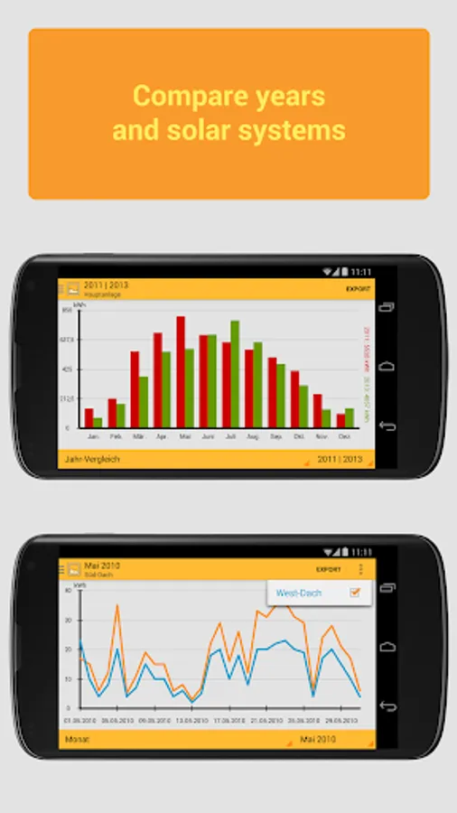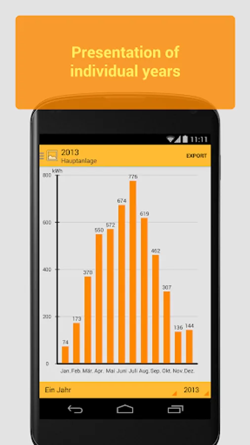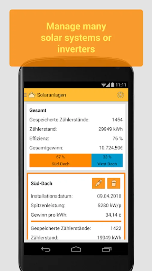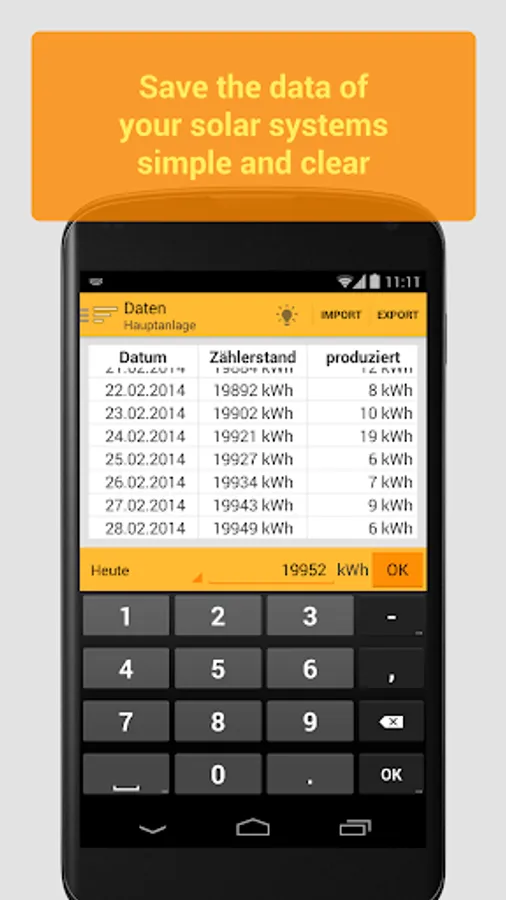 You can read the meter reading of your photovoltaic plant regularly and store in the app. From the data won so Solarstats prepares different diagrams which give you a beautiful survey of the performance of your solar plant.