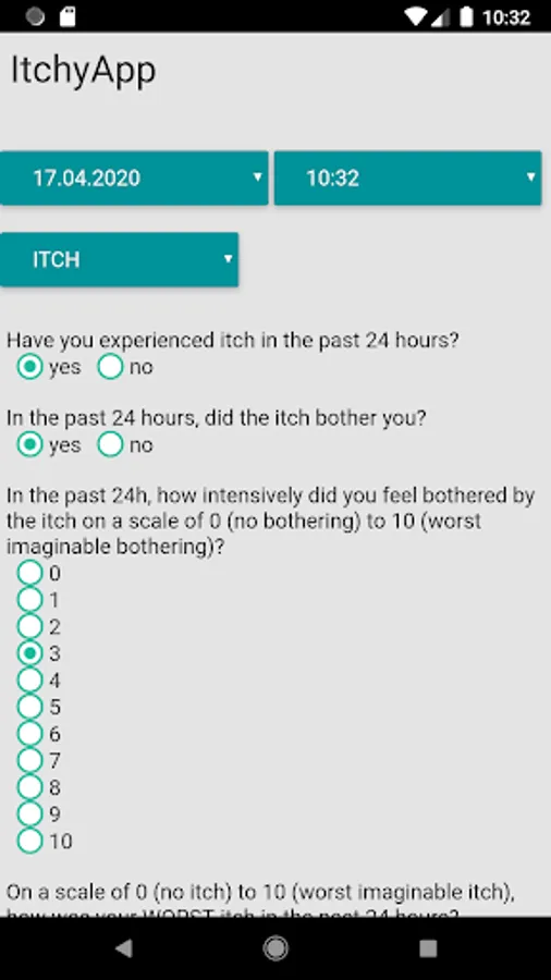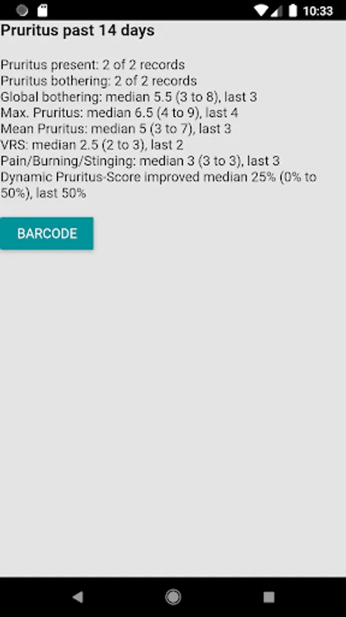 Patients with chronic itch (pruritus) can document their symptoms with this app. The questionnaire was developed by a European team of experts. If you answer these questions on a regular basis, the app can provide a summary of your symptoms for Your doctor. Your data can be transferred with a barcode.
