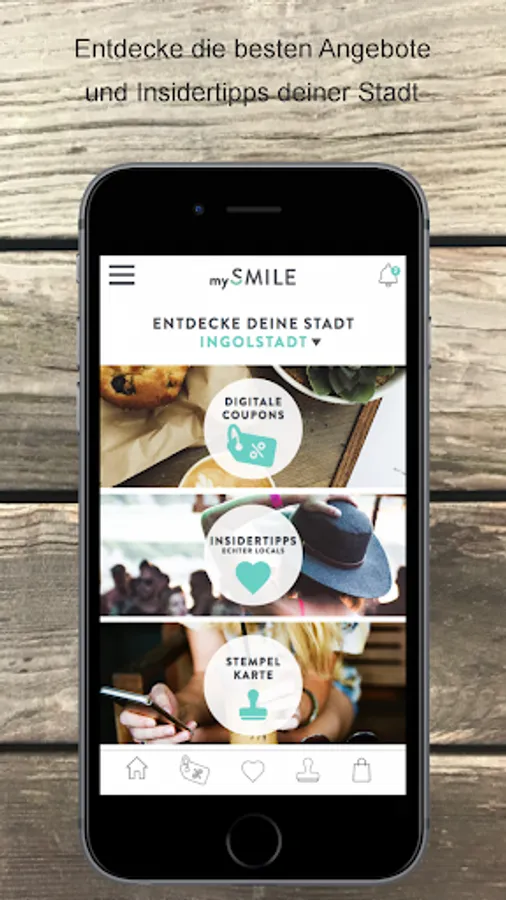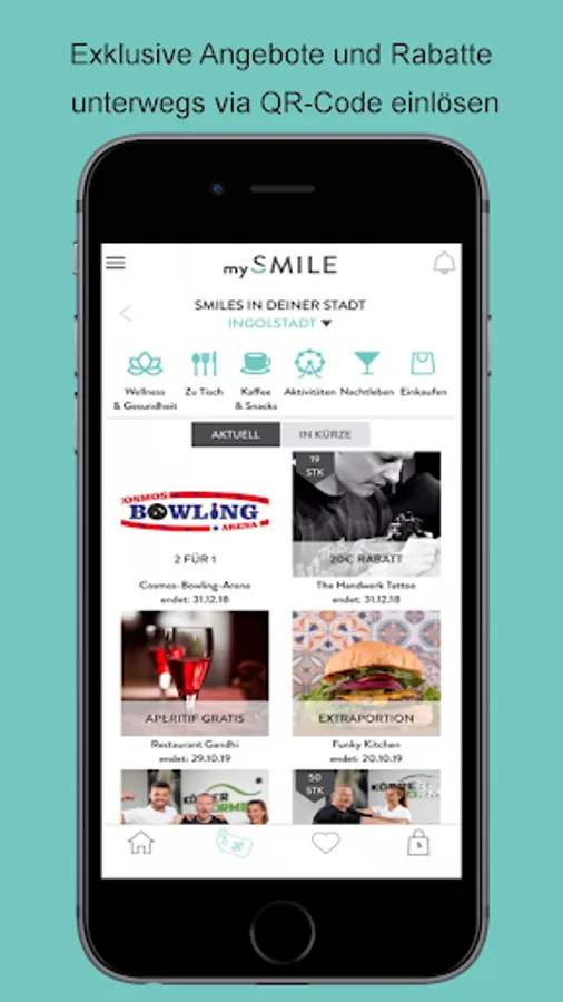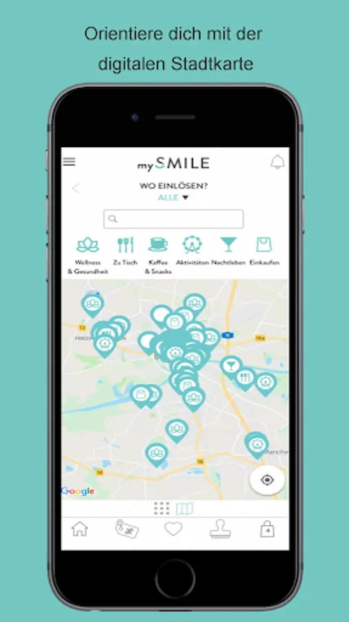 With the free mySMILE app you can use digital offers, discounts or vouchers (smilies) from partner companies in the region and redeem them as a digital coupon directly from the app in the store, for example: