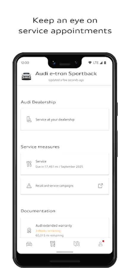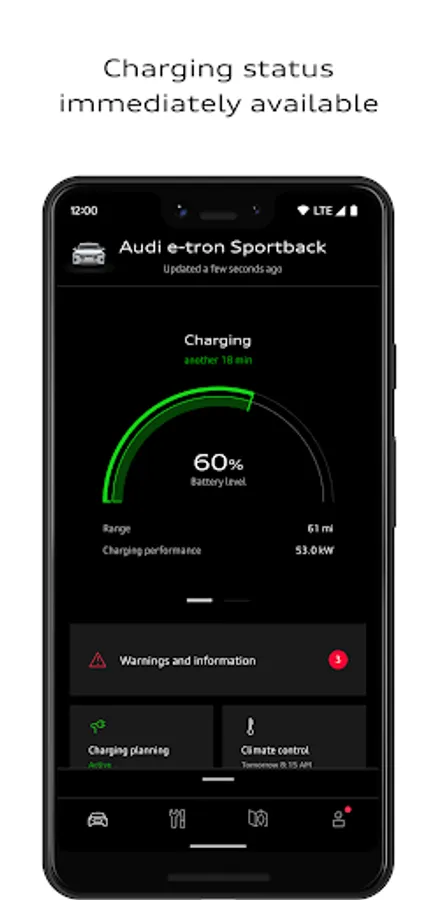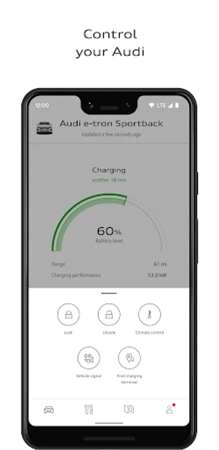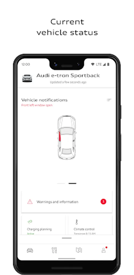 With an active Audi connect (2) trial or subscription on eligible vehicles, you can access your vehicle's real-time information, and help keep abreast of your vehicle’s status (3), fuel level, estimated driving range, and lots more. Use your app to conveniently plan trips and send routes and destinations directly to your vehicle. Even climate control, as well as locking and unlocking your vehicle doors, can be operated via the app. (Depending on the model and the equipment packages of your Audi, availability of features and services may vary.)