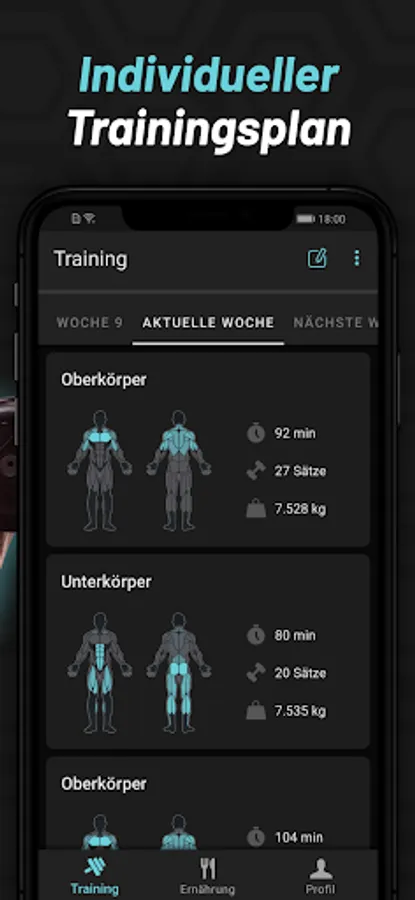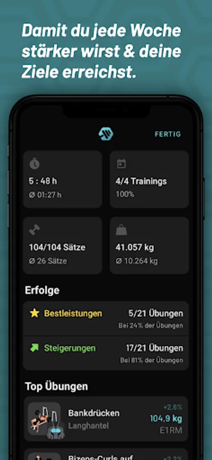 After each training session and each week, you will receive a detailed progress analysis of how long you have been training, how much weight you have moved in total and which exercises have improved you or set new personal bests.