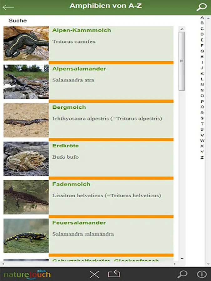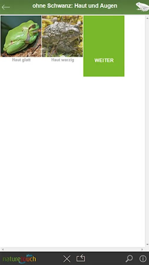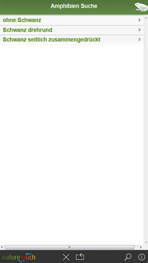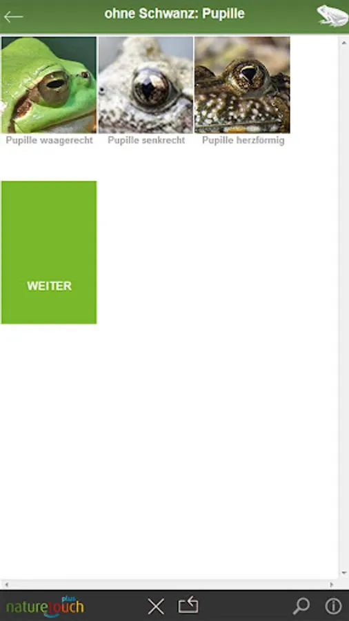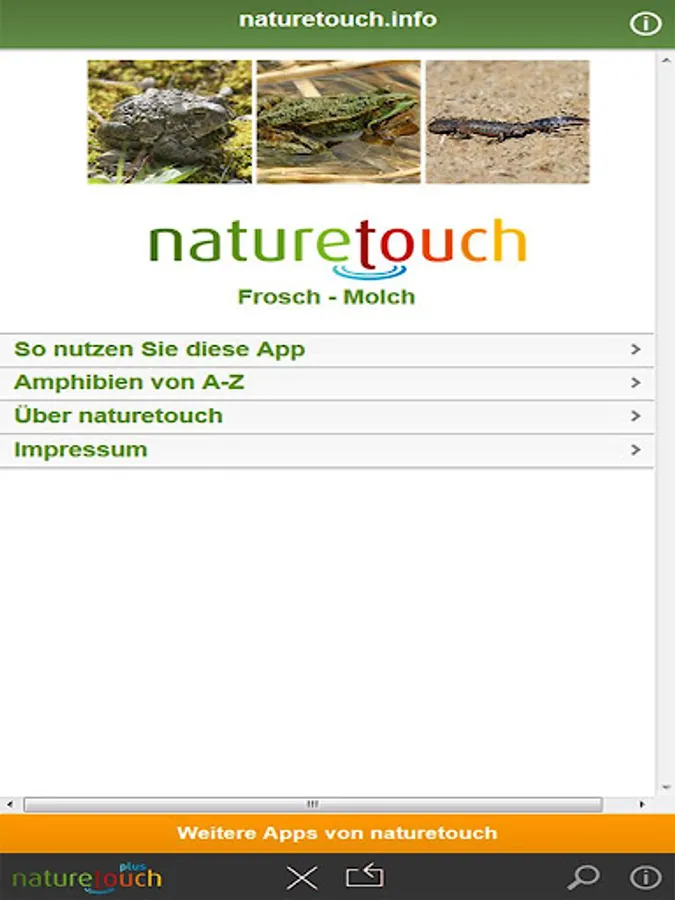 Frogs, toads, toads, salamanders, newts determine in Germany, Austria and Switzerland. An animal leaders of Nature Touch. Nature Touch-determination: With a few clicks for this animal - and easy for everyone. With detailed portraits, many pictures and animal sounds. Tree frog, green frog, agile frog, water frog, moor frog, toad, salamander, newt and others.