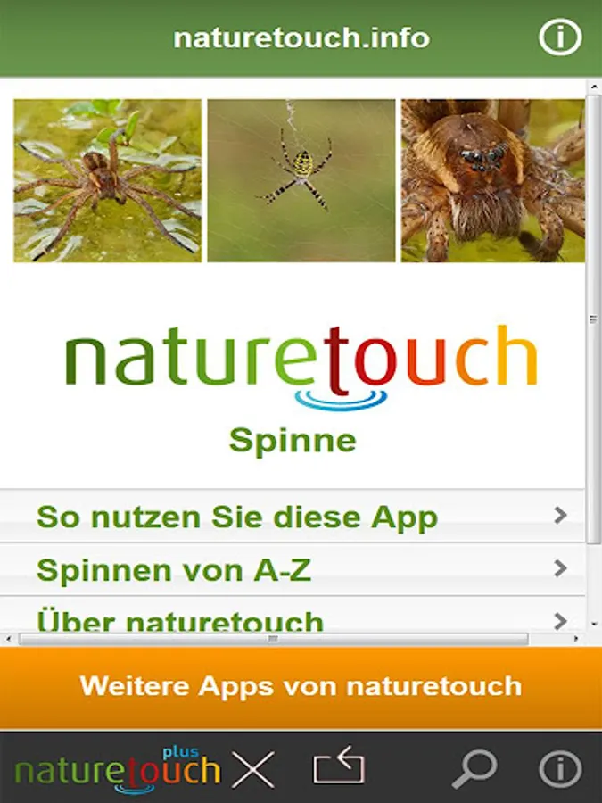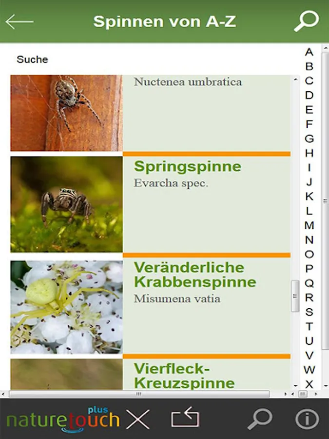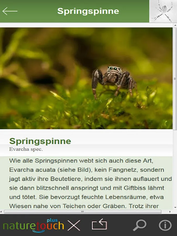 determine spiders recognize the important Spiders Germany and determine: Garden spider, wolf spider, spider ball, Books Scorpio, cellar spider, house spider, Green Huntsman Spider, Green crab spiders, and others. With detailed portraits and Fotos.Tierführer of Nature Touch. With a few clicks to this animal.