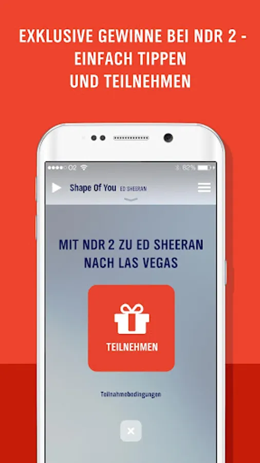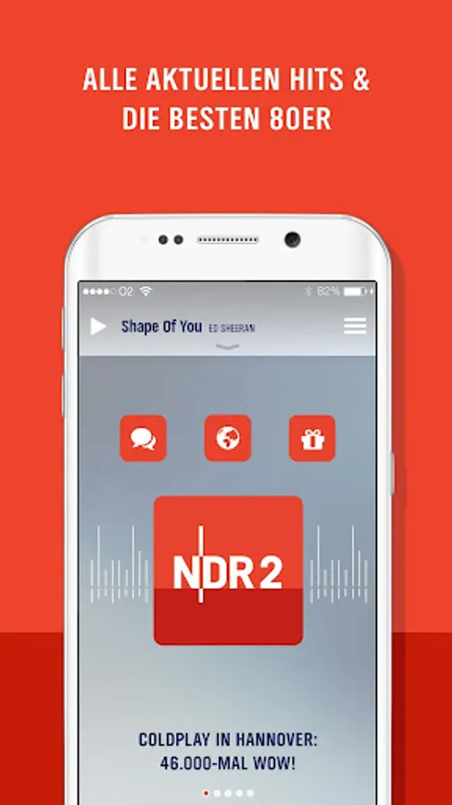 We bring the stars up north - and with us we go to the stars! Tickets for sold-out top concerts that meet stars up close and breathtaking trips to events - from Adele to Depeche Mode, from Katy Perry to Mark Forster, from Coldplay to Ed Sheeran. Take part in exclusive competitions in the NDR 2 app with just one tap!