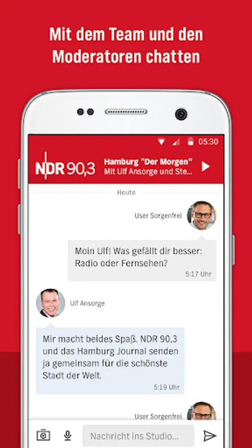 - Messenger : With the messenger directly into the studio of NDR 90.3: chat, send voice messages or report traffic jams!