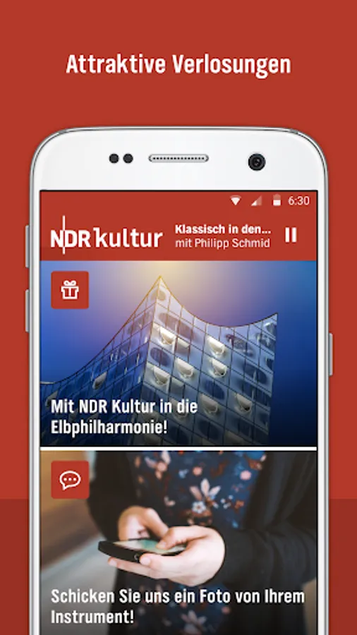 For this we send the NDR Kultur app to cultural events: NDR Kultur raffle tickets for readings, concerts at the Elbe Philharmonic Hall, book packages and events of our cultural partner.