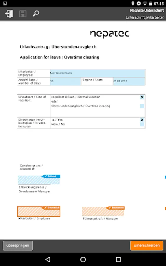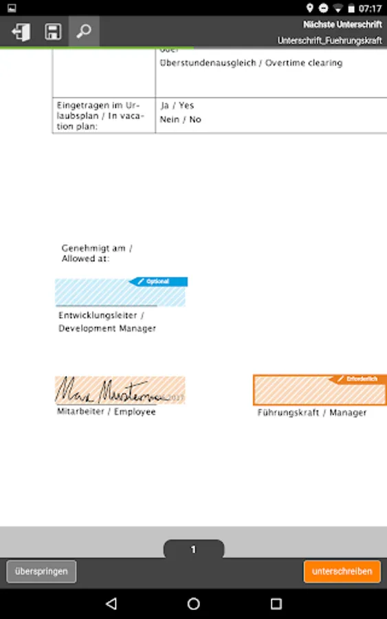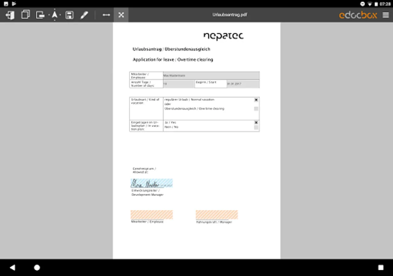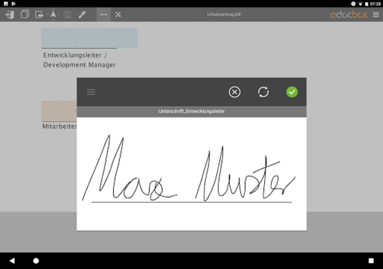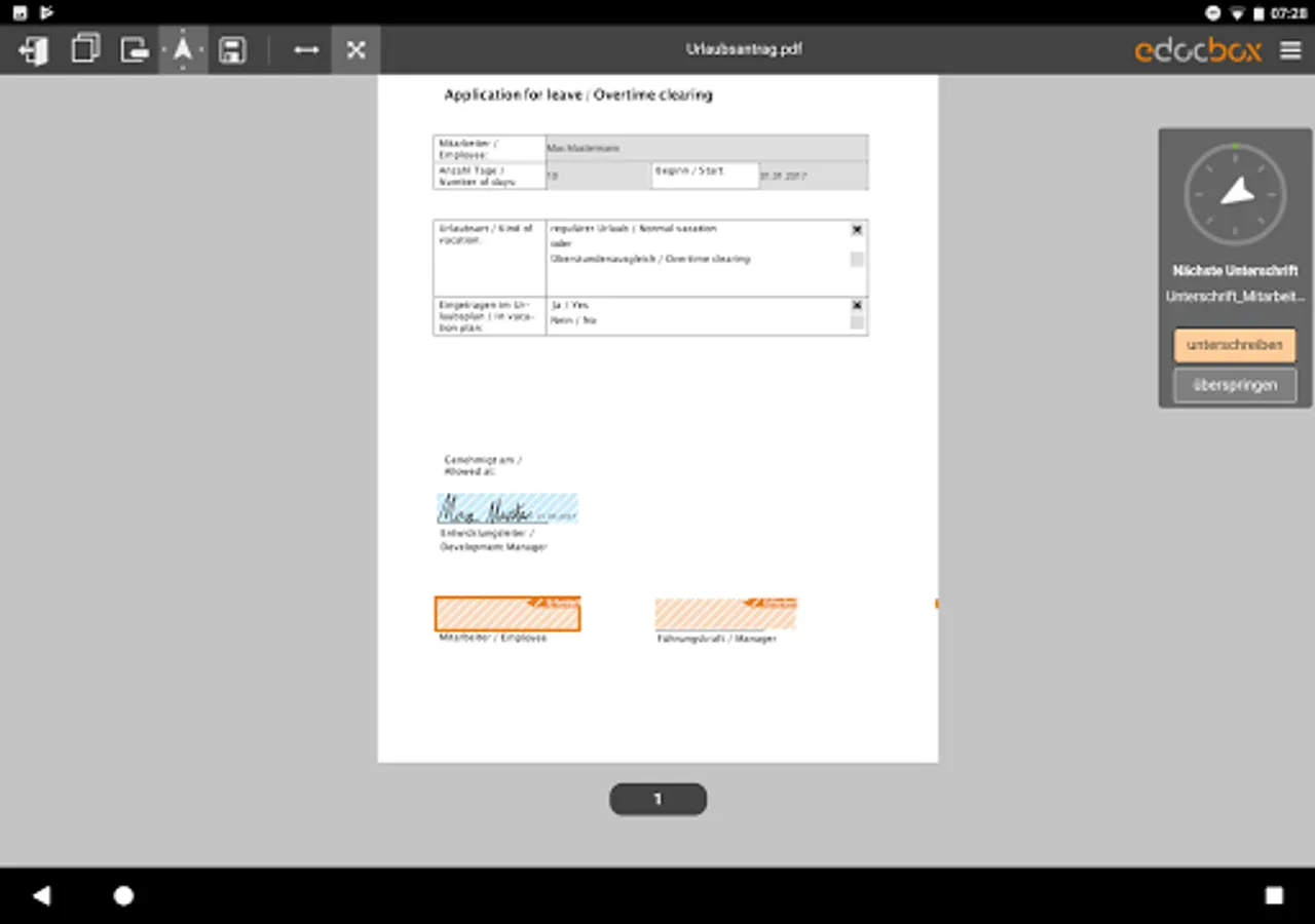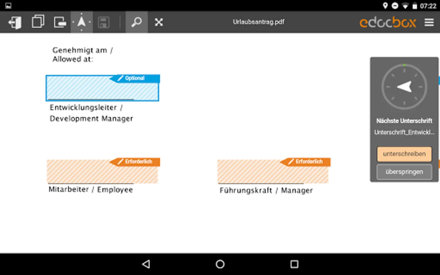 The paperless office tool. Form fields in PDF documents can be edited and saved. If a PDF document contains signature fields, these can be signed directly on the mobile device. If a PDF contains no signature fields, these can be added with the app