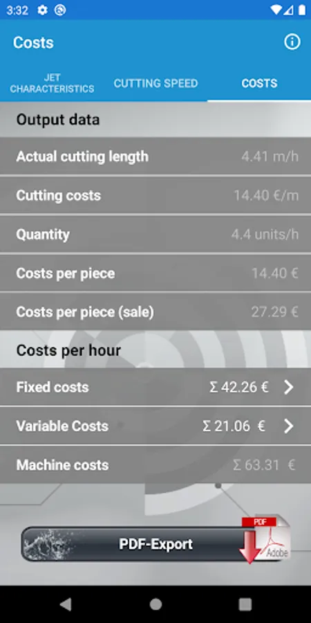 A machine-hour cost assessment can be generated in Area 3. In the input area, the material and contour-specific features, as well as the necessary fixed and variable costs are recorded. Based on the data entered, the cutting costs per meter, unit costs and the costs per machine hour are determined.