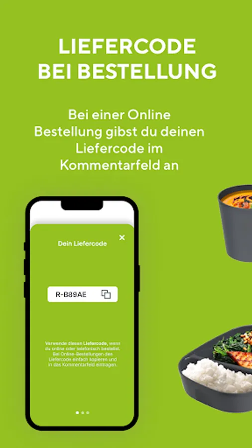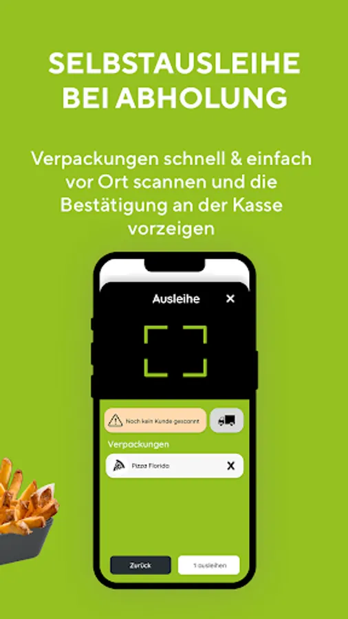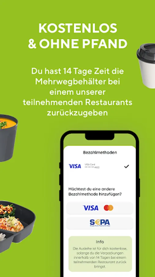 Register with your login details and bank details. You can then borrow your food and drinks in reusable containers in sustainable packaging from the participating to-go and take-away providers and also from delivery services by scanning the QR code. This process is free for you! You have 14 days to return the containers to a partner specified in the app. If you miss the return date, despite our reminders, you automatically buy the container and are allowed to keep it.